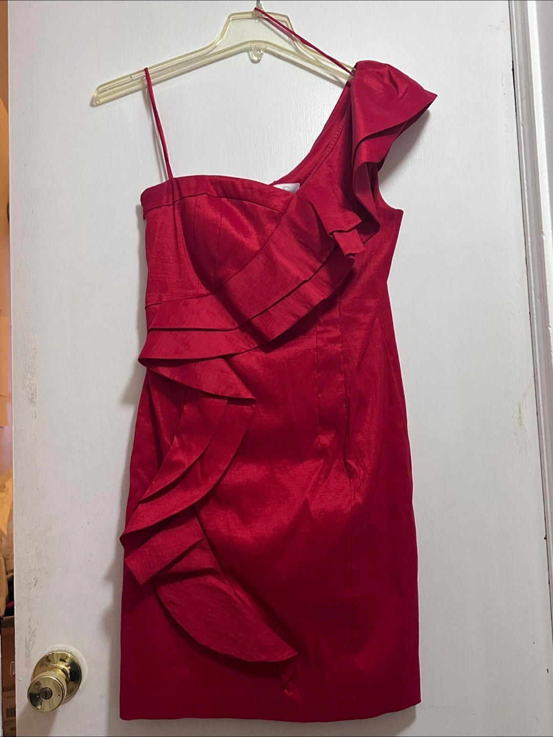 Stunning red mini dress. One shoulder design. Ruching detail. Size 10.