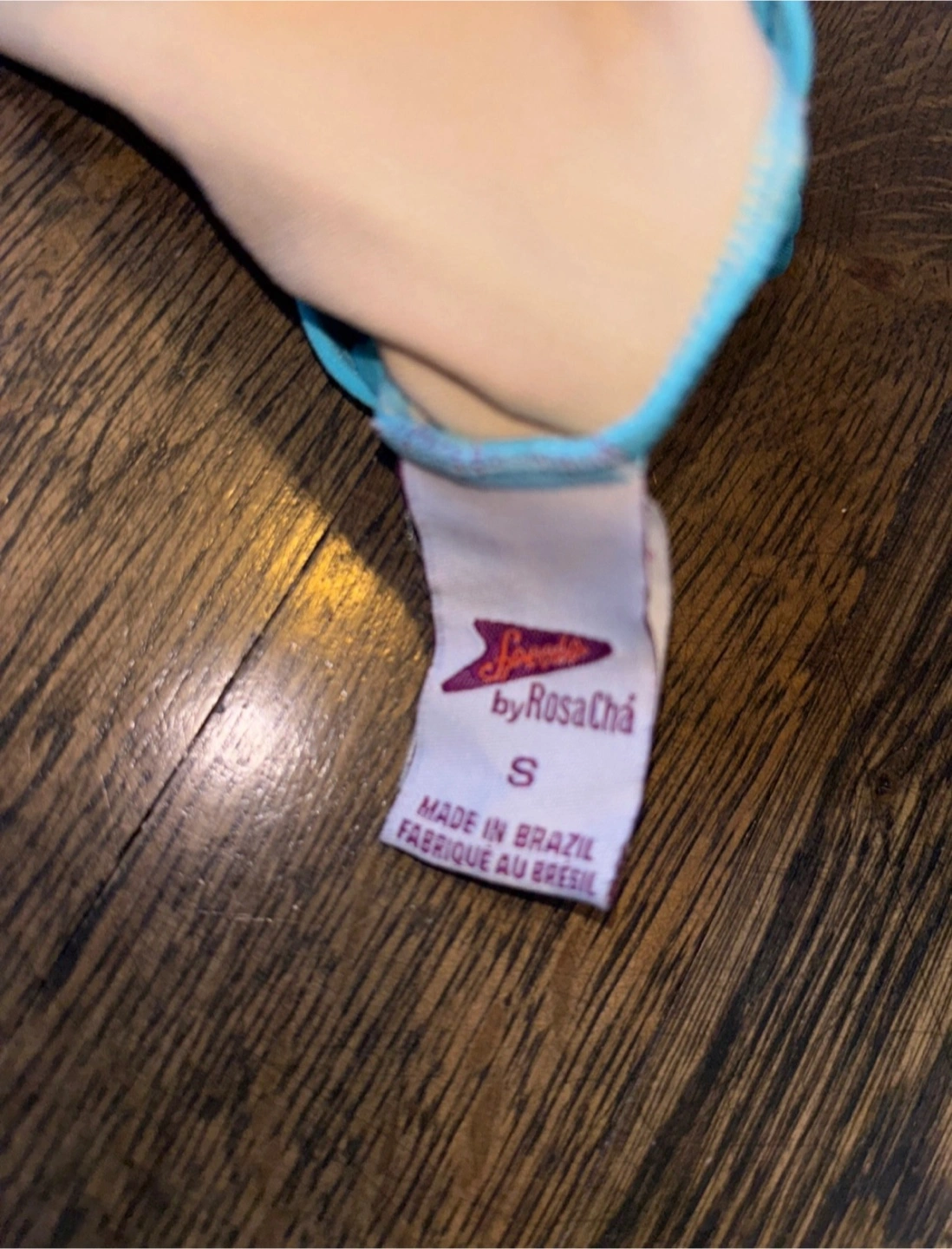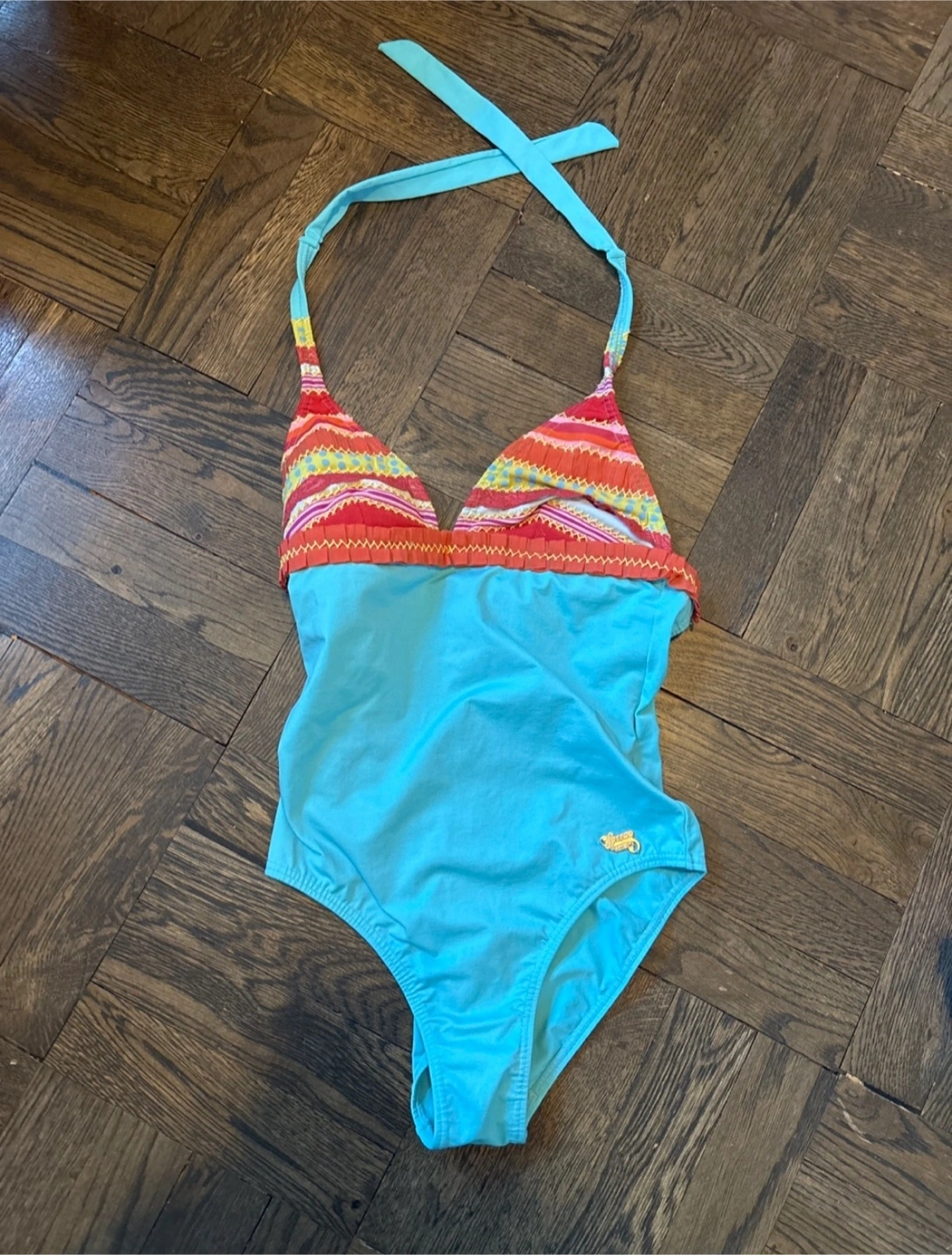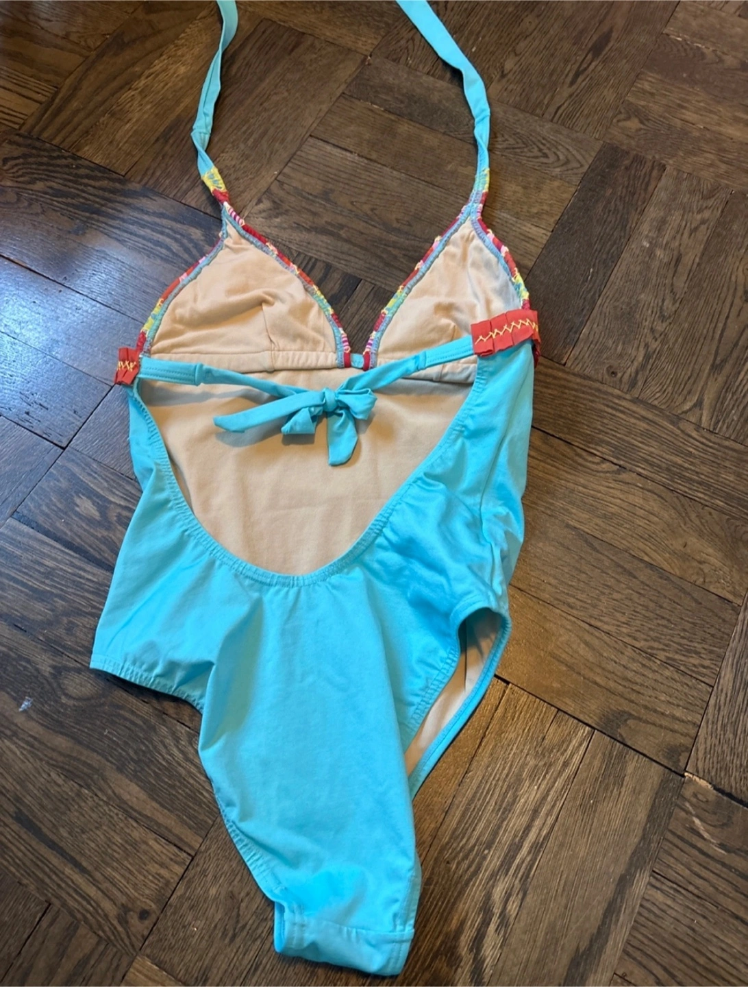 Turquoise one-piece swimsuit. Halter neck and tie back. Small colorful detail at the bust. Made in Brazil. Size small.
