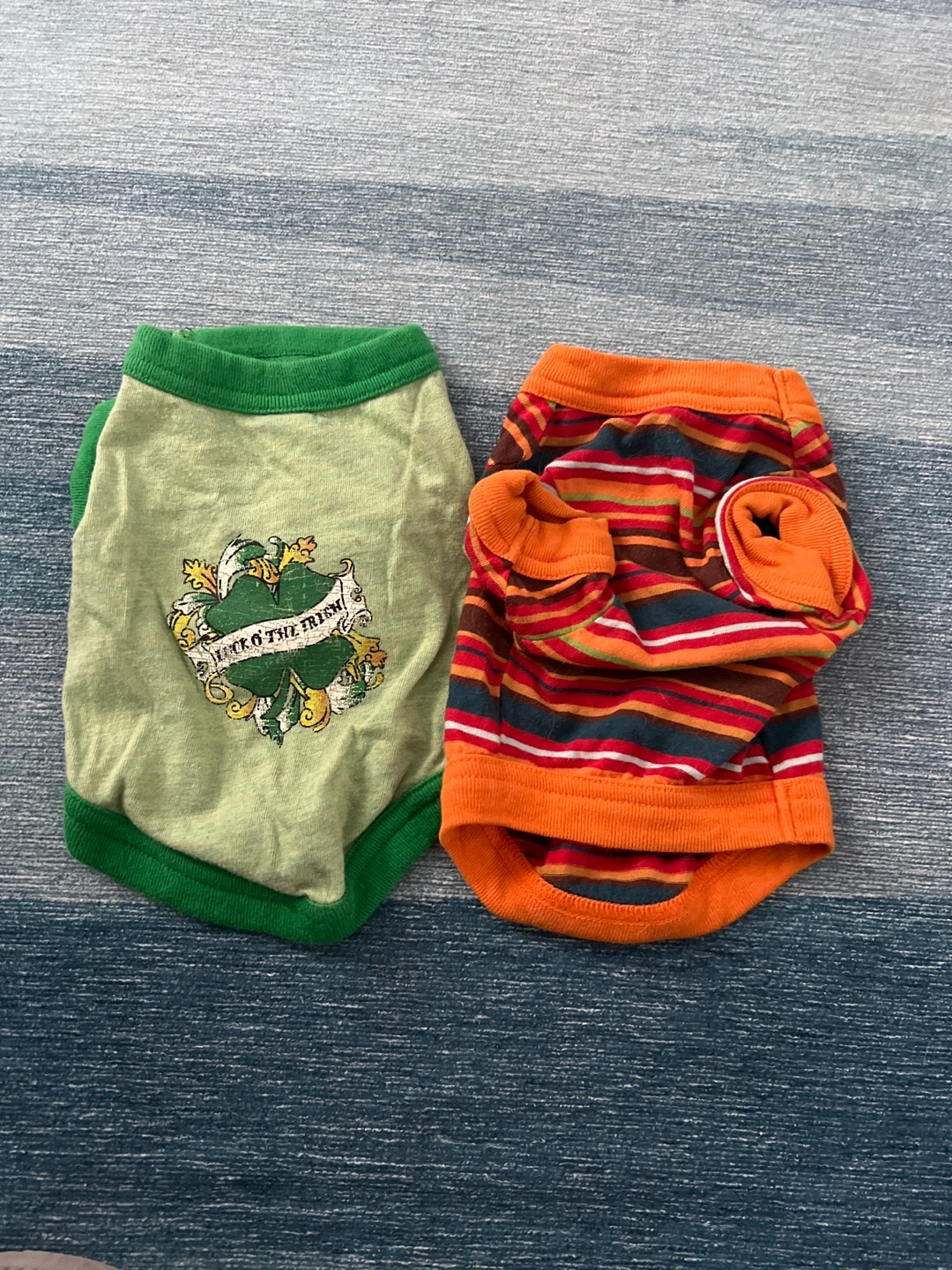 Two cute dog shirts. One green shirt features an Irish-themed design. The other is orange with multicolored stripes. XSmall size.