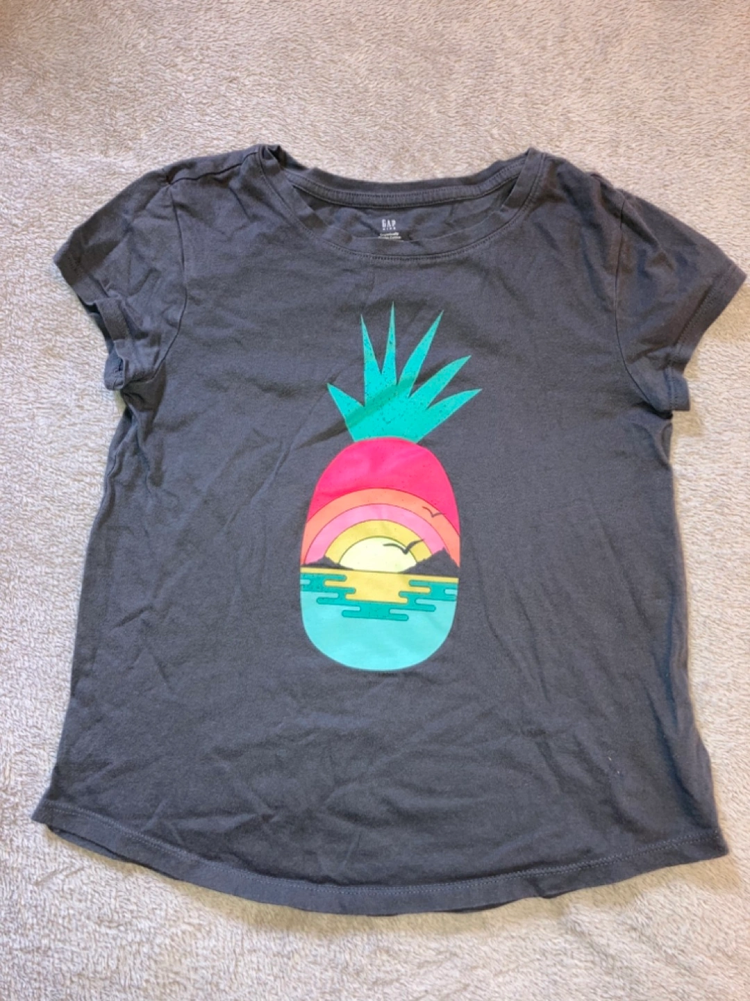 Grey short sleeve t-shirt. Features a pineapple graphic with a sunset design. Excellent condition.