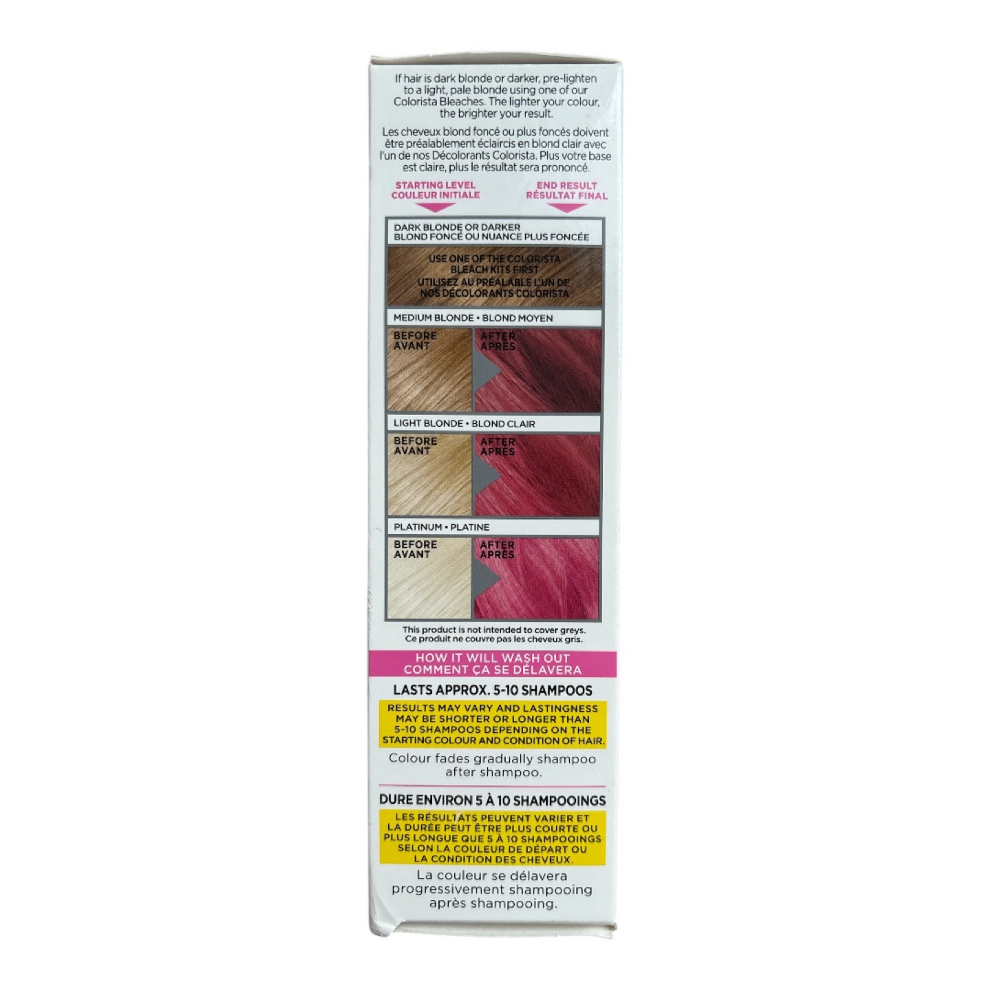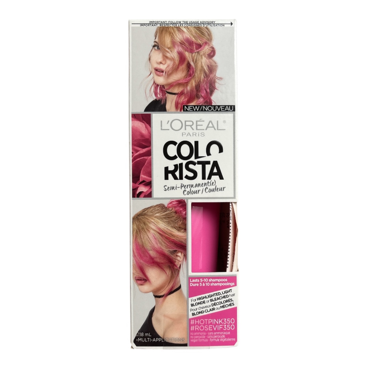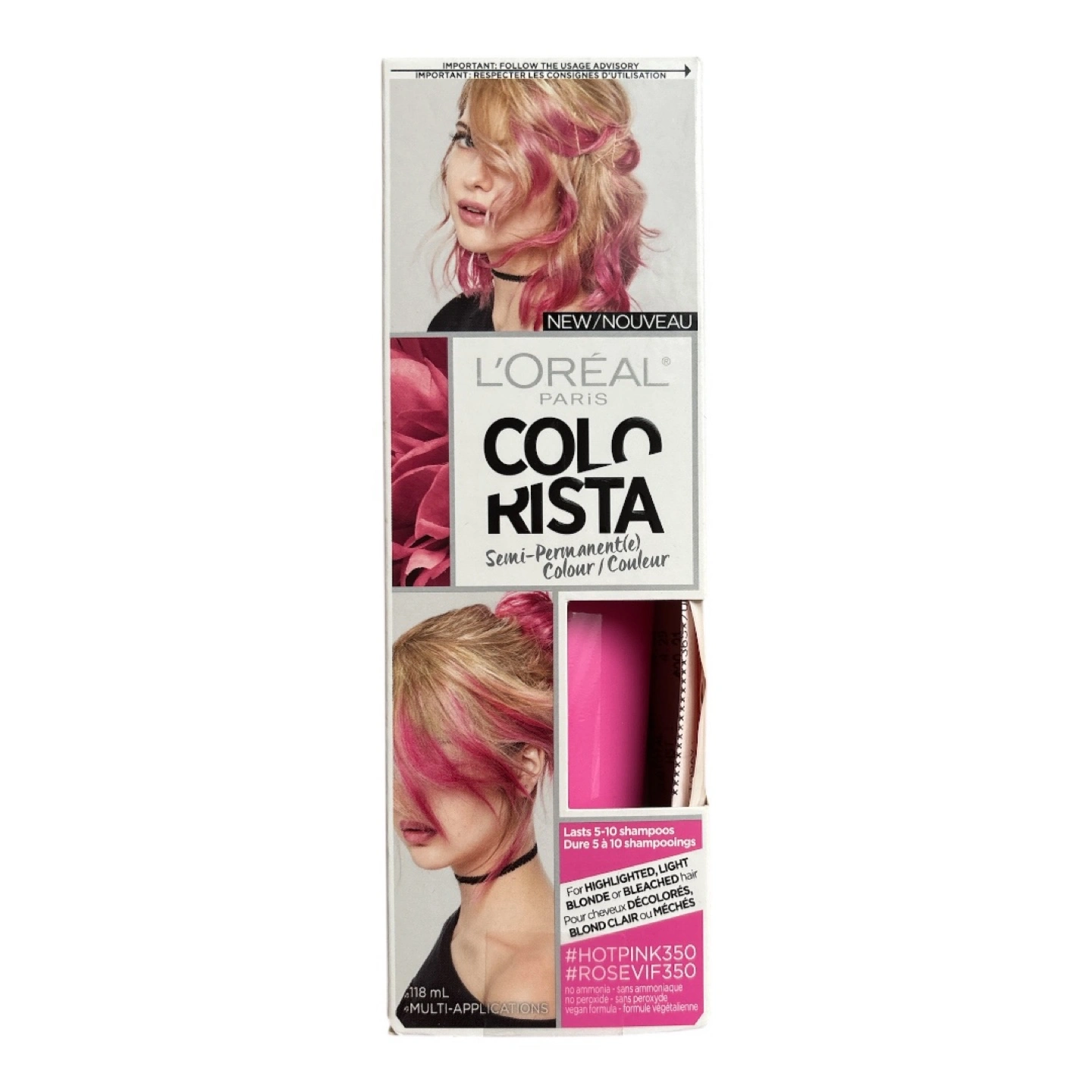 New/unopened box of L'Oréal Paris Colorista semi-permanent hair colour. Shade #HotPink350. Lasts 5-10 shampoos. For highlighted, blonde, and light coloured hair.