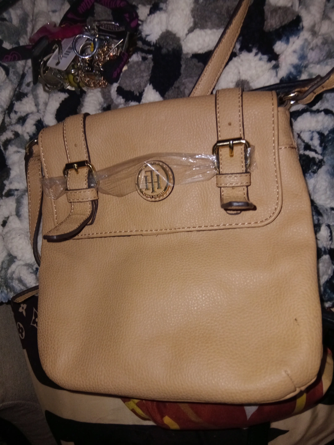89Tan coloured crossbody bag. Features a flap closure with gold buckles. Interior is navy blue with a zippered pocket. Adjustable shoulder strap. Small and stylish.