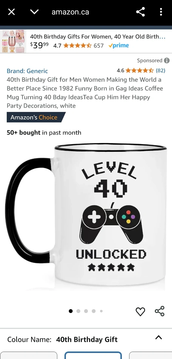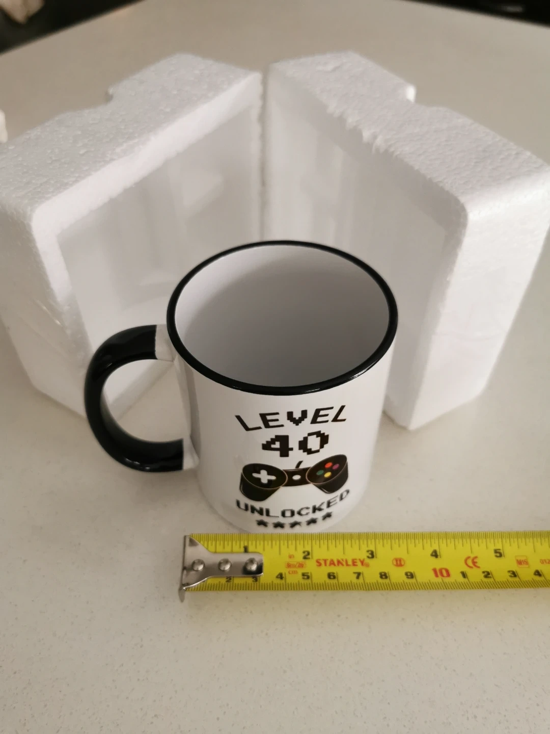 11 oz ceramic coffee mug. Black handle and rim. Gamer themed design. Image printed on both sides. Perfect 40th birthday gift.