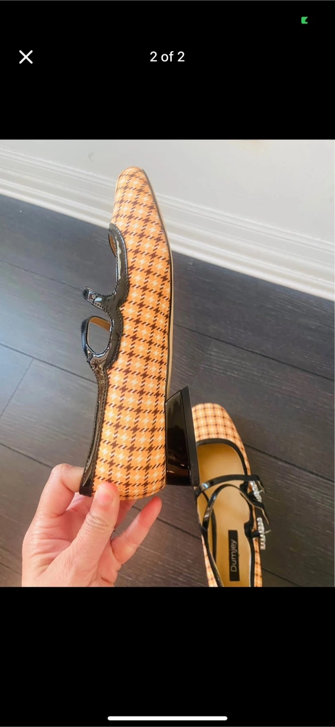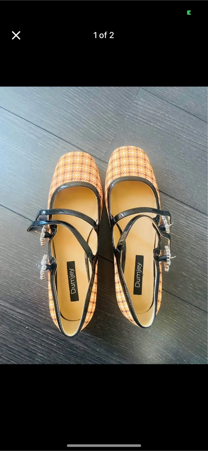 Women's shoes, orange and black houndstooth pattern. Low heel, double strap design. Rhinestone accents on straps.