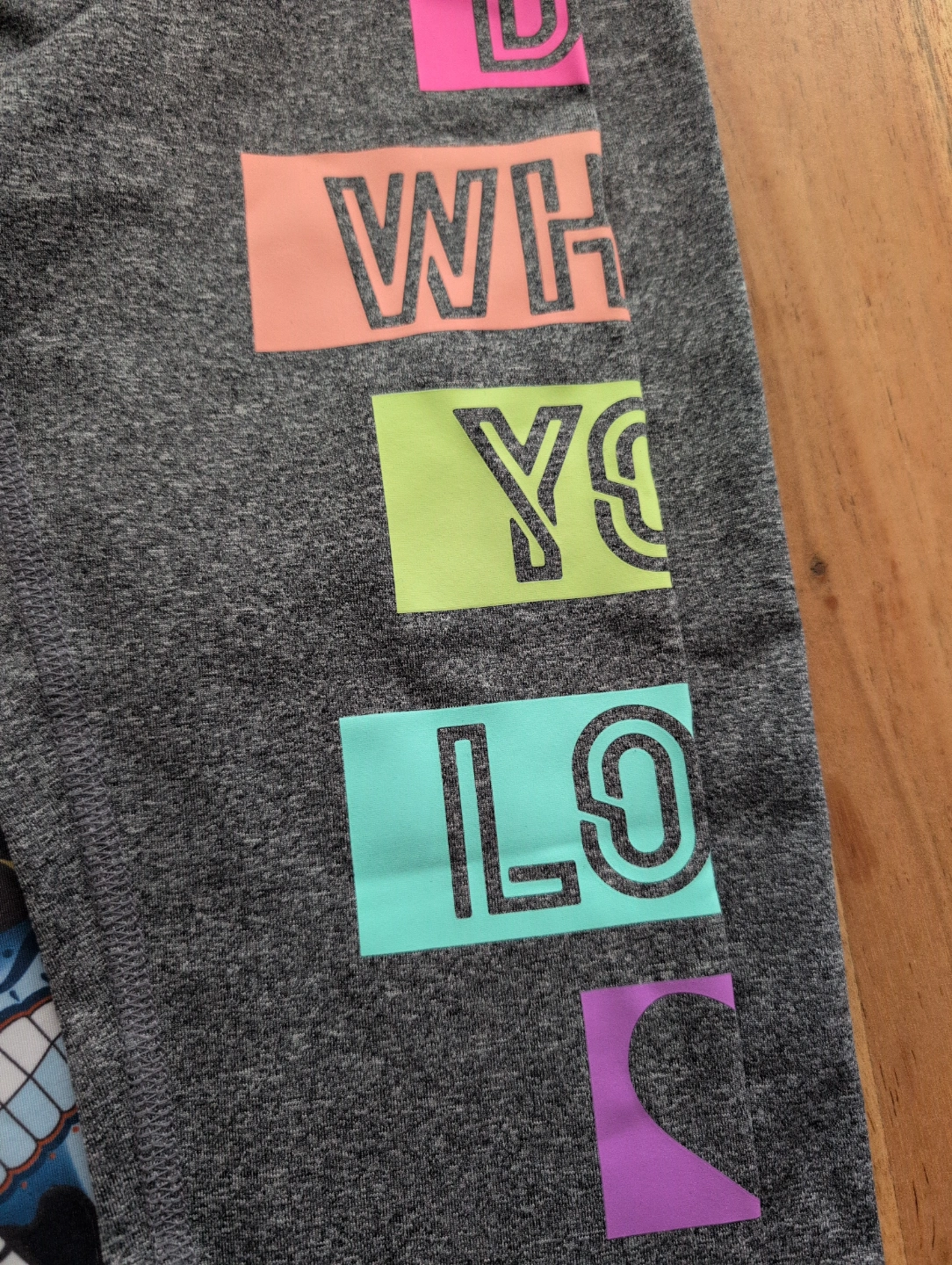 - Grey with colourful lettering down the side. Size Runs very small (XS)