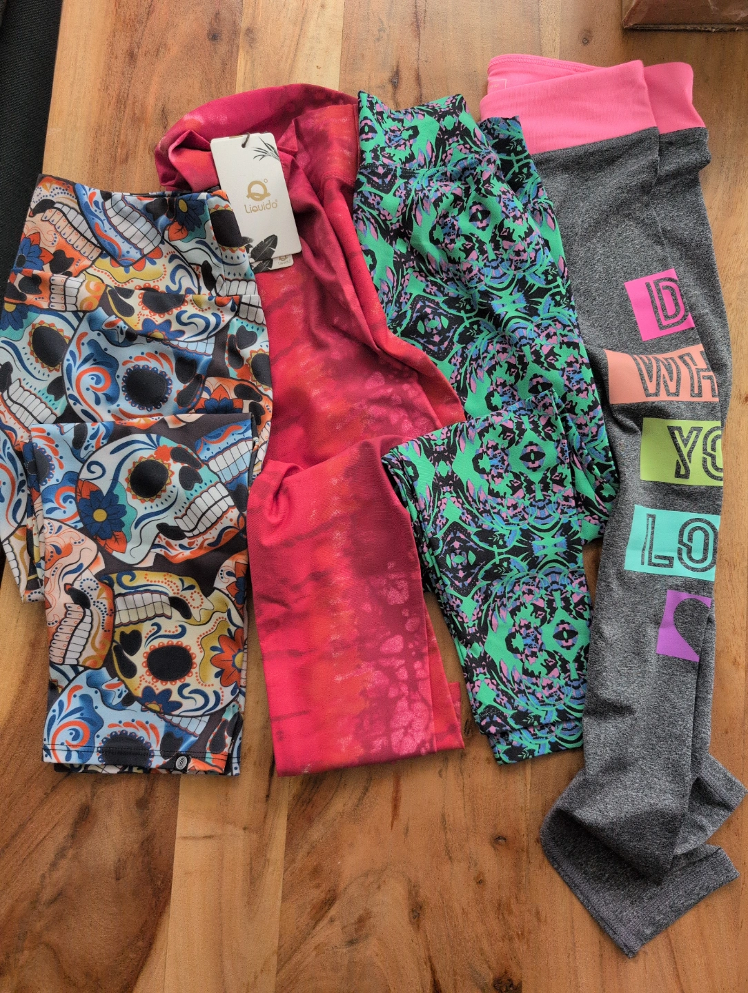 - Tag still on. Liquido brand pink and reddish pattern. (says Large but runs smaller than that - full pant length)