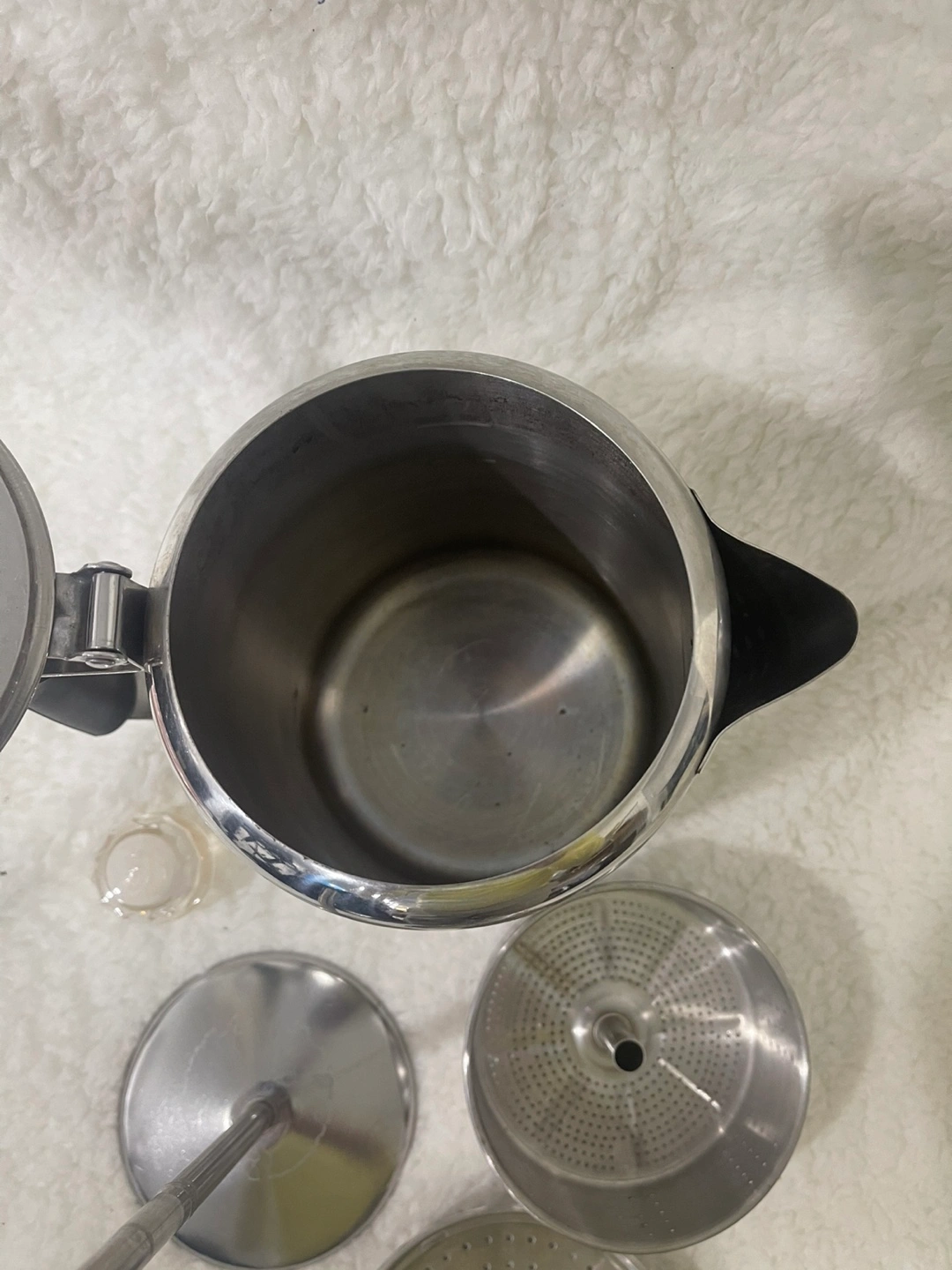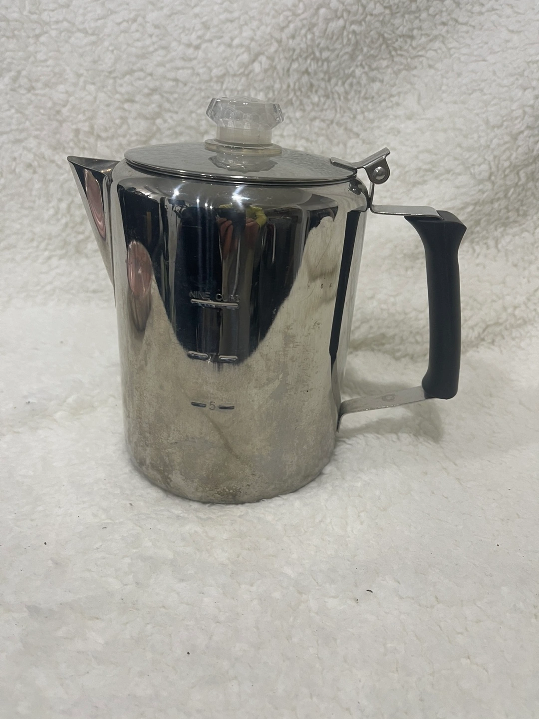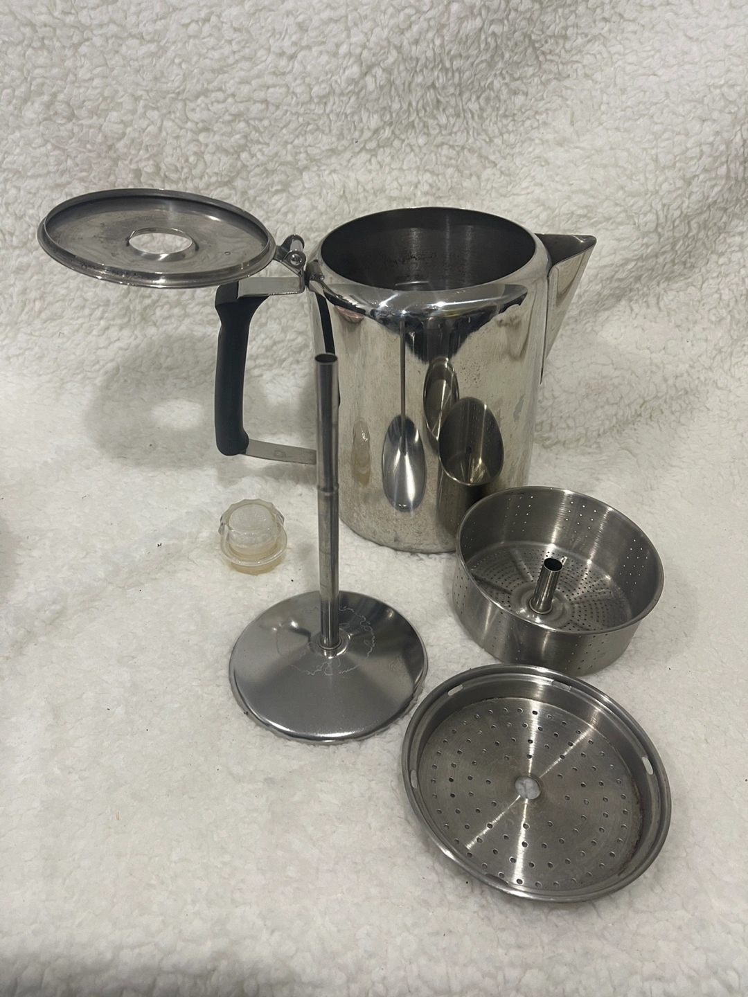 Stainless steel stove-top percolator. Nine cup capacity. Includes all parts. Great for camping or everyday use.