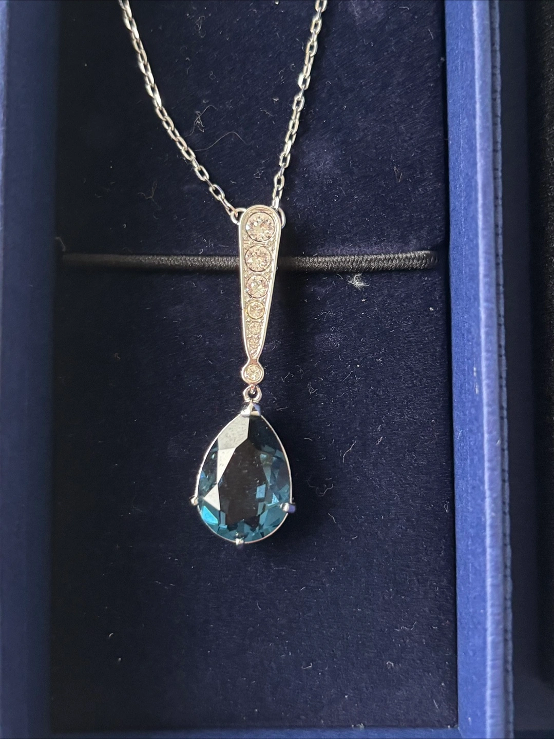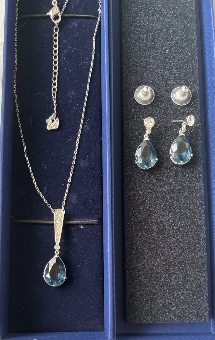 Beautiful and elegant Swarovski jewellery set. Features a teardrop pendant necklace and matching earrings. Dark blue crystals. Silver-toned metal. Rhodium plated.
