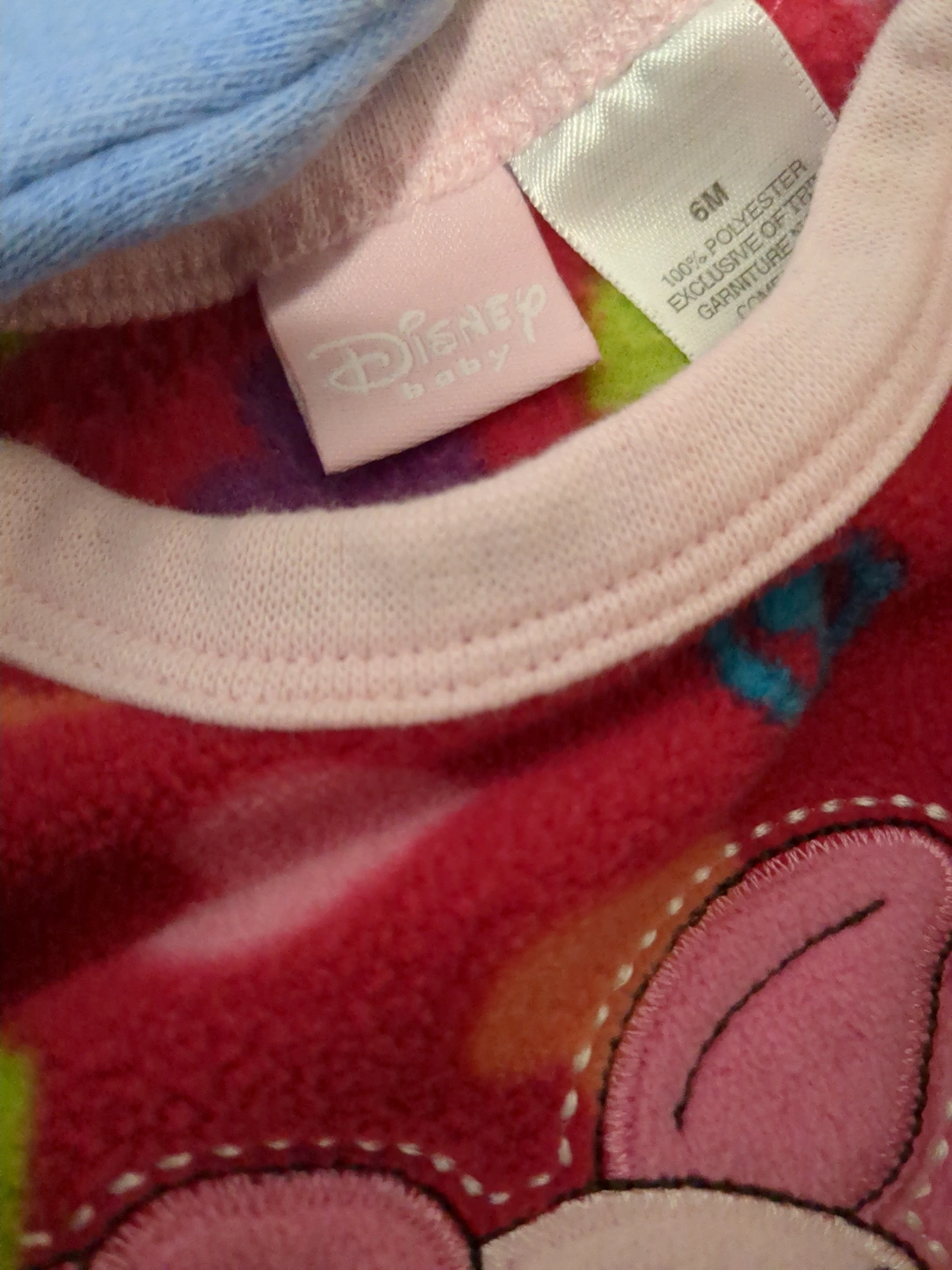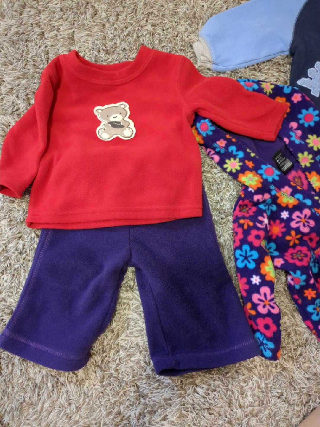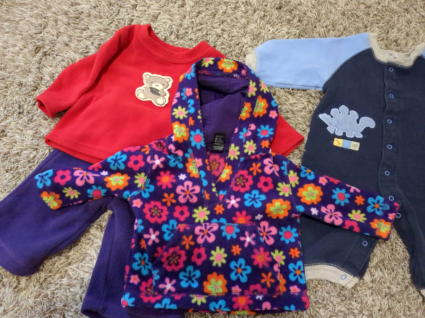 Bundle of five 6-month-old baby clothes. Includes fleece pyjamas, a fleece top and bottom set, a hooded fleece jacket, and a snap-up sleeper. Various colours and designs. Great for layering.
