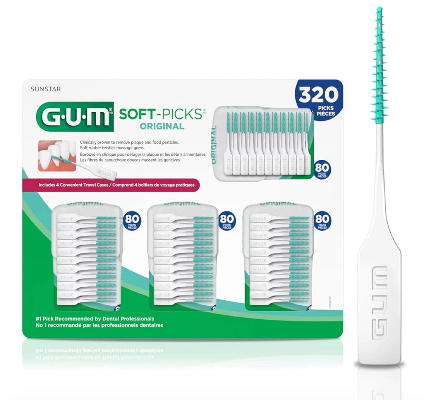 320 Soft-Picks Original interdental cleaners. Includes 4 convenient travel cases. Flexible rubber bristles. Clinically proven to remove plaque and food particles. Safe for orthodontics, implants, bridges and crowns. Stimulates gums. Easy to use.