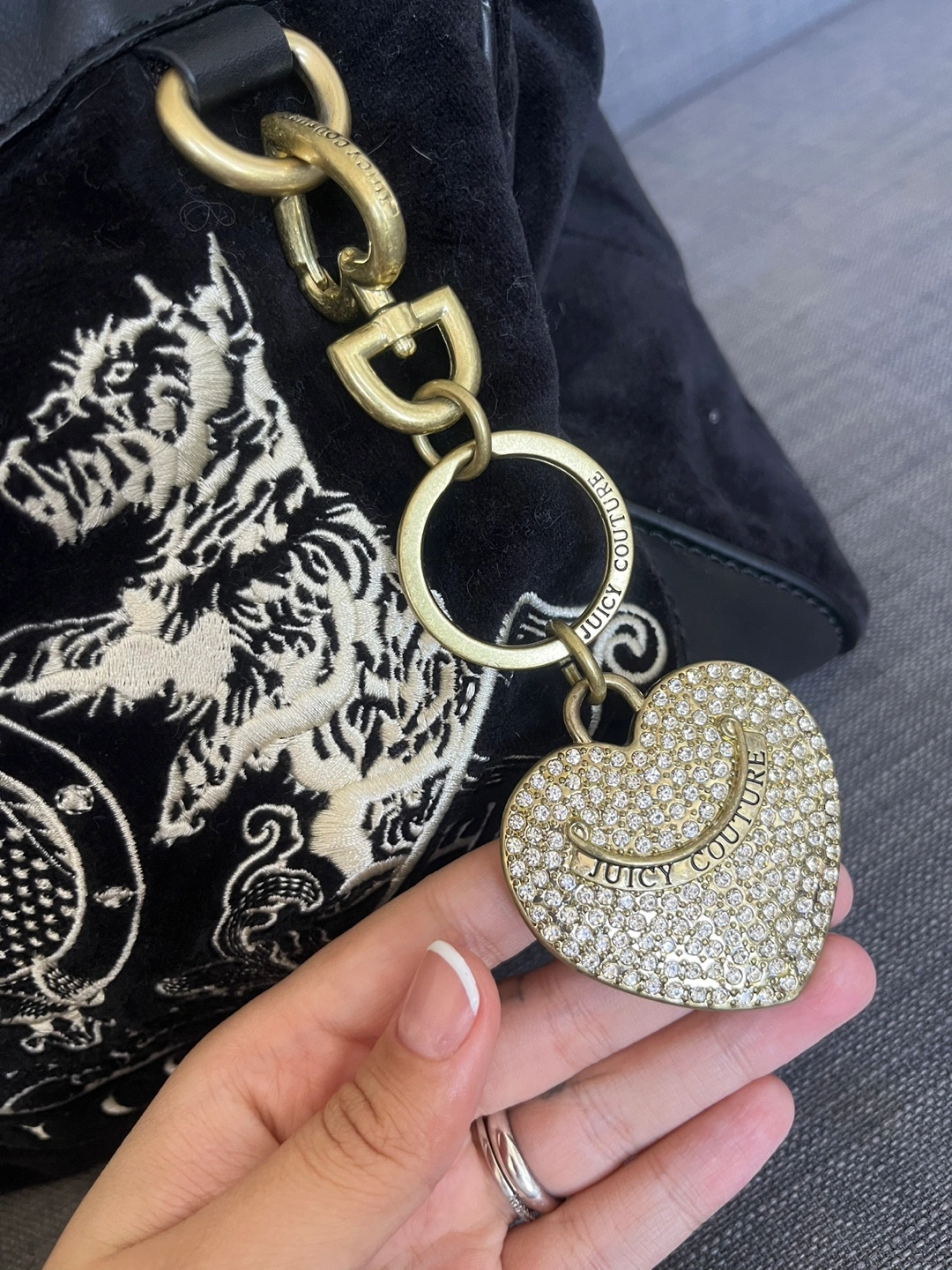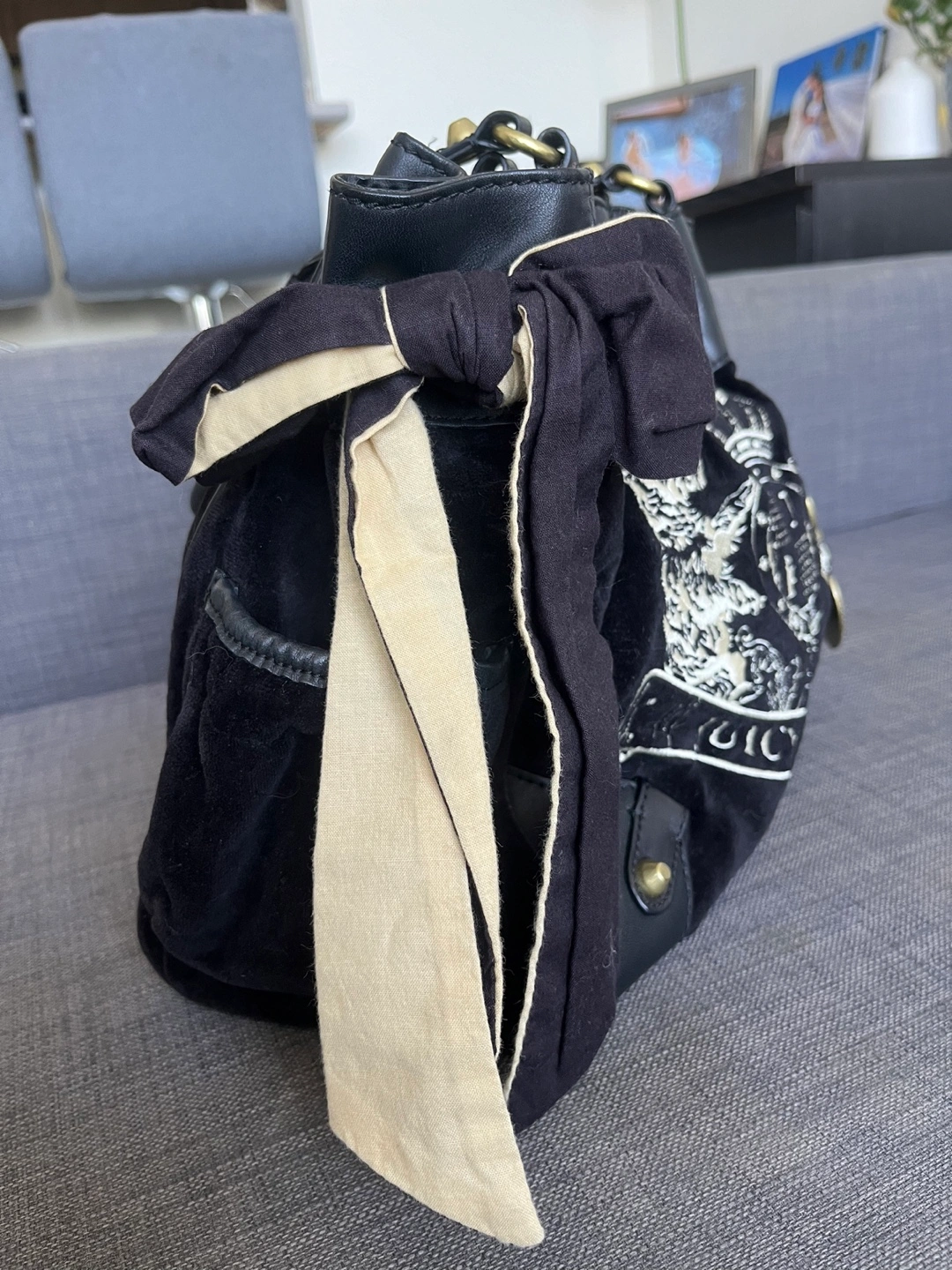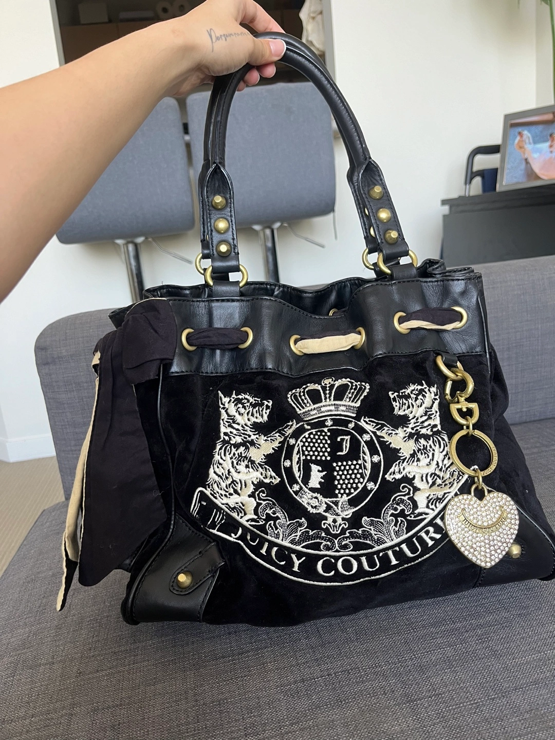Black velour tote bag. Features gold-tone hardware, drawstring closure, and a cream-coloured ribbon accent. Embroidered logo detail. Includes a Juicy Couture charm. Pre-owned.