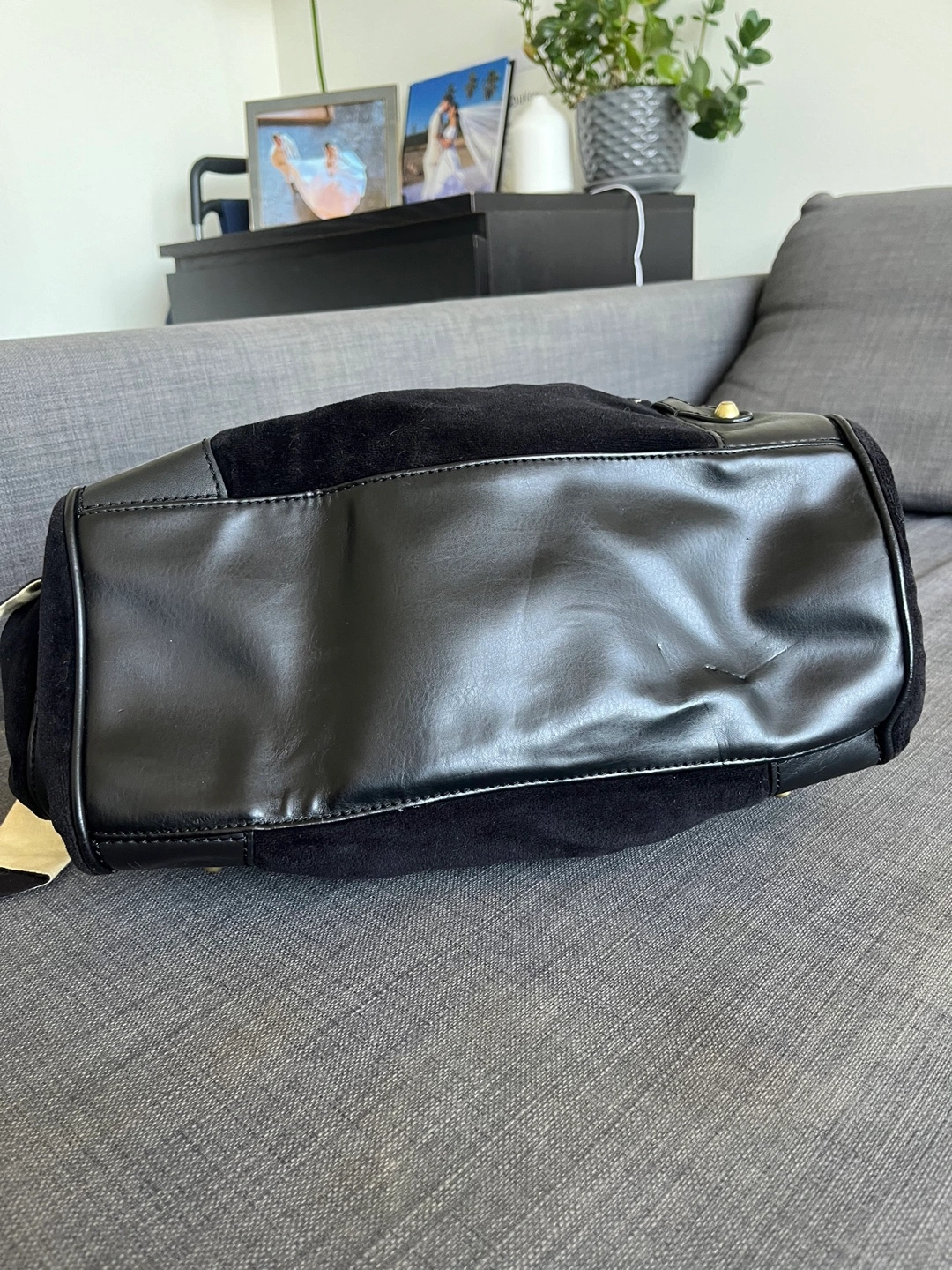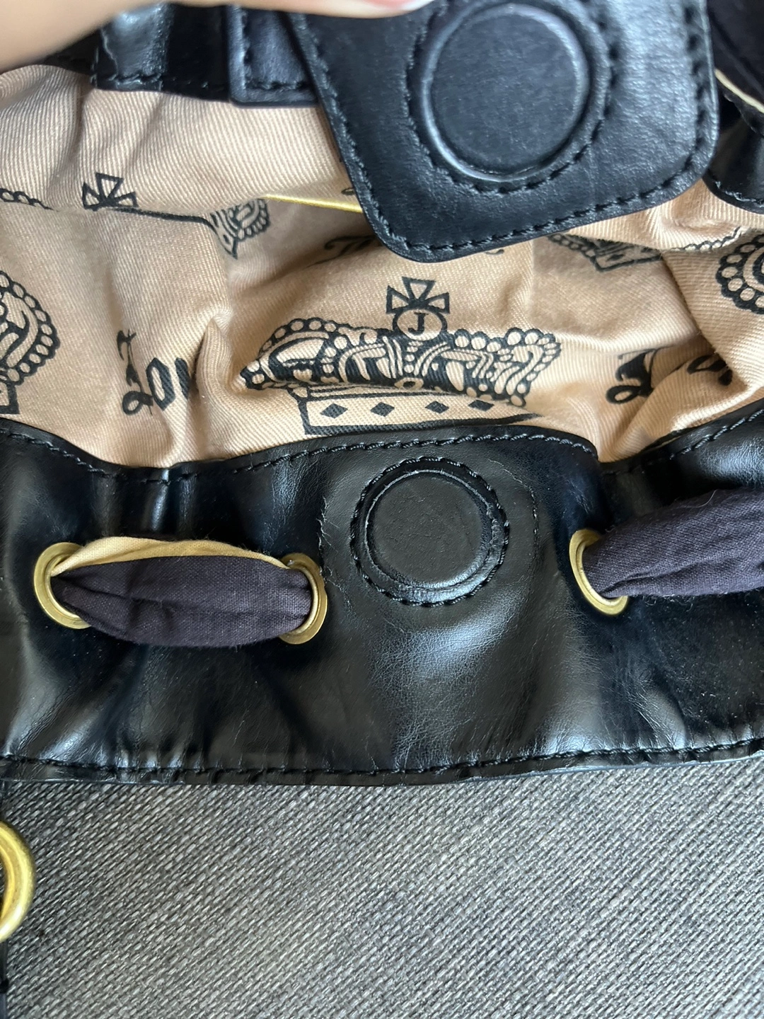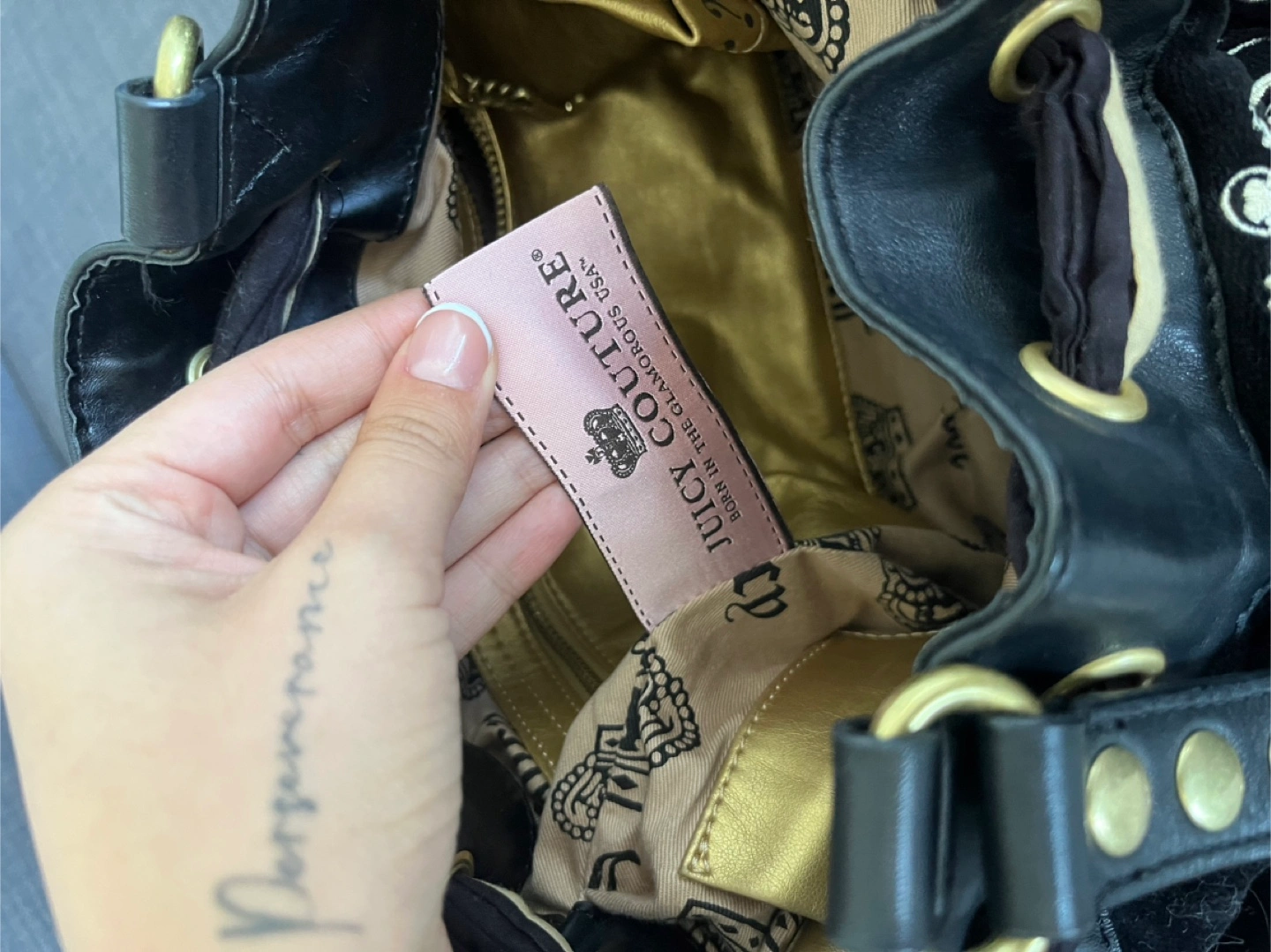 Black velour tote bag. Features gold-tone hardware, drawstring closure, and a cream-coloured ribbon accent. Embroidered logo detail. Includes a Juicy Couture charm. Pre-owned.