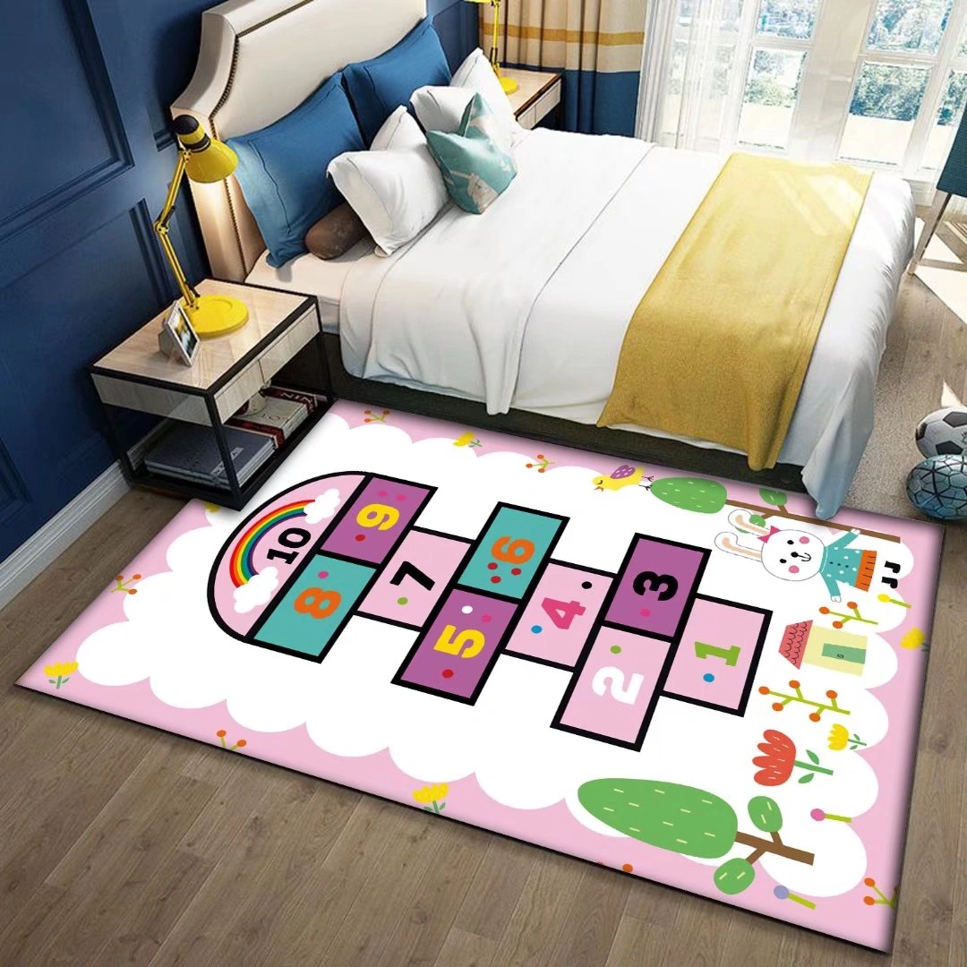 Set of six colourful and playful children's rugs. Features alphabet, numbers, flamingos, hopscotch, vehicles and whale designs. Perfect for nurseries or playrooms. Soft and durable material. Various sizes and shapes.