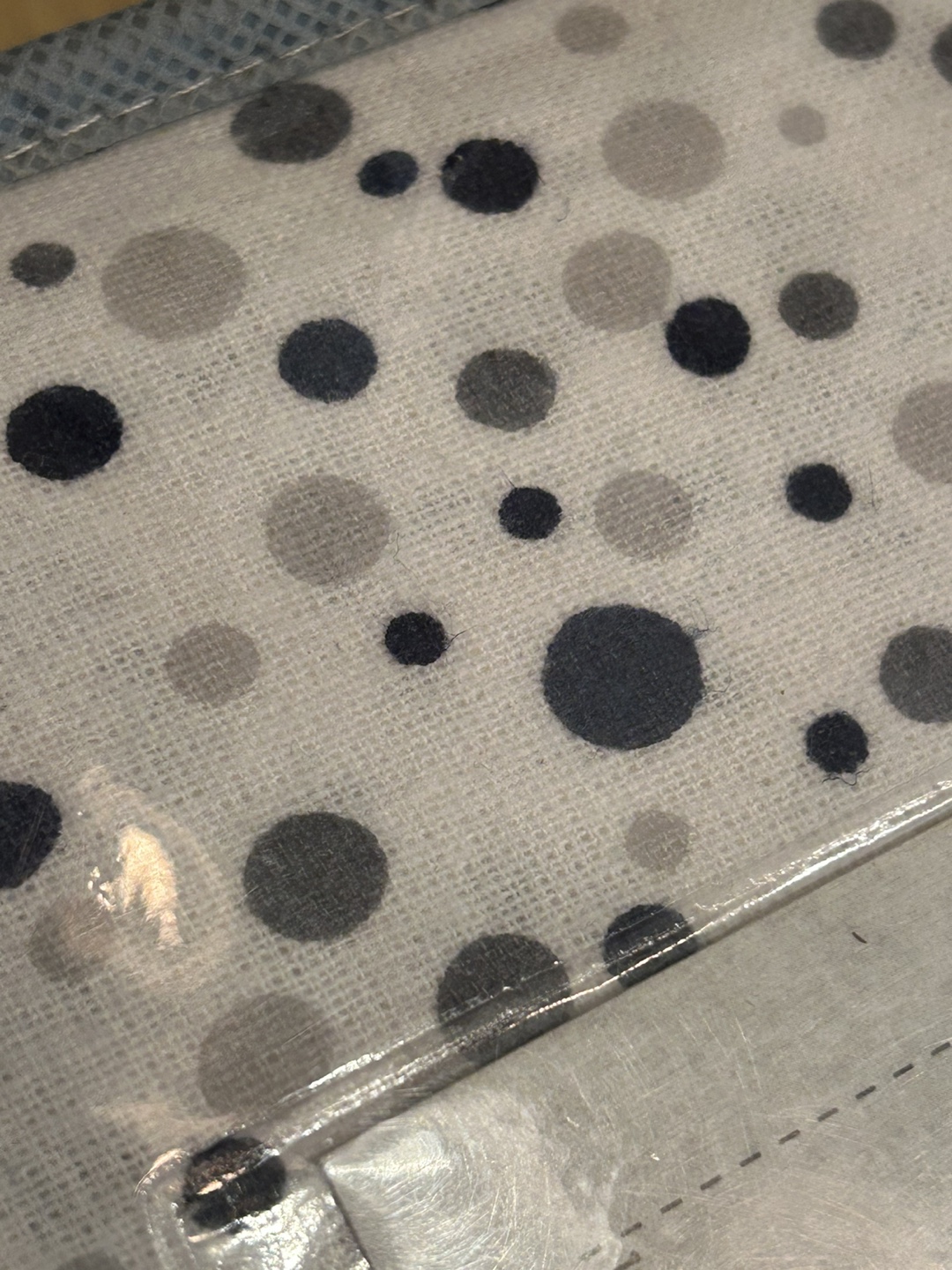 Cream with grey and navy polka dot pattern.