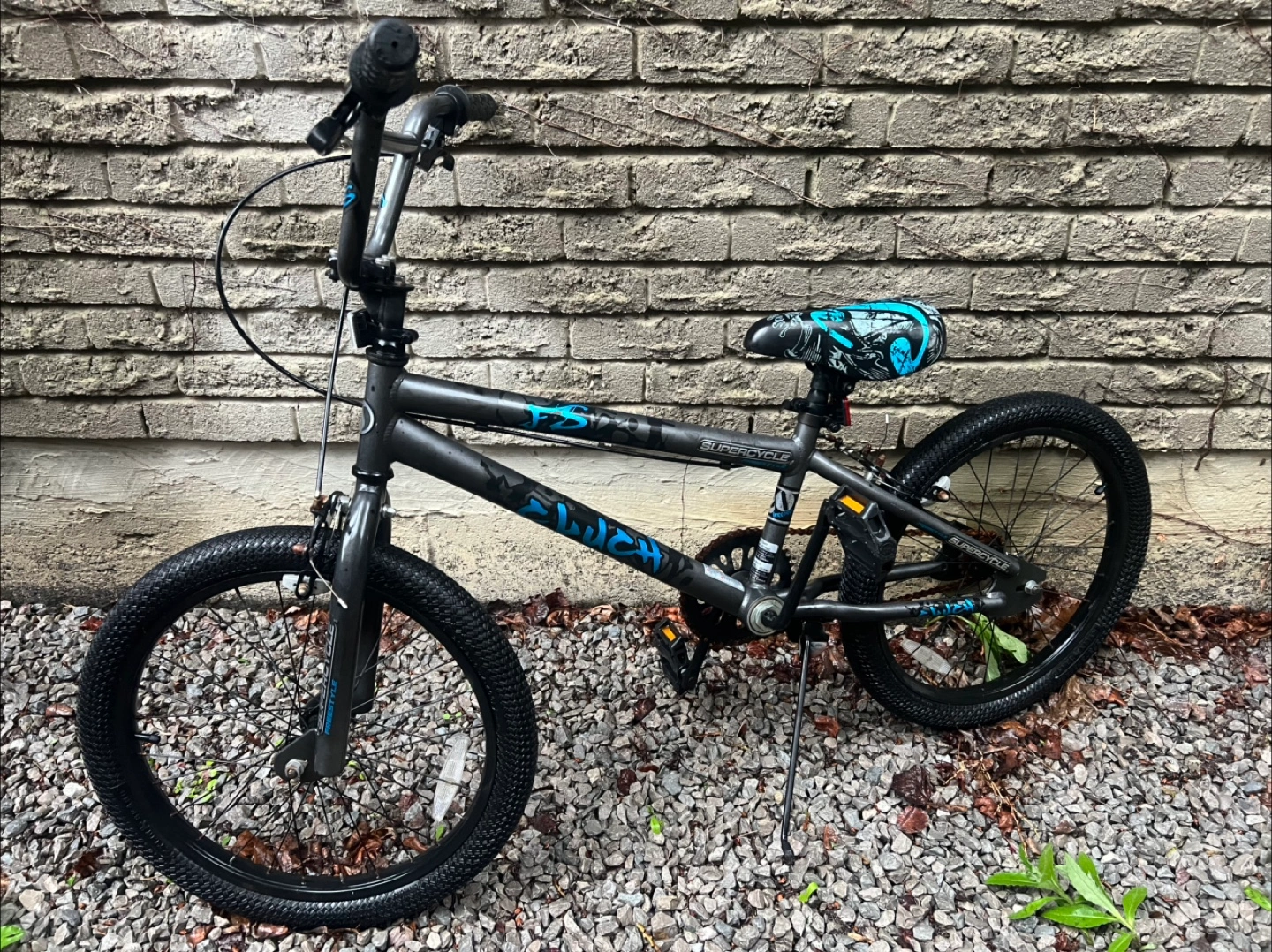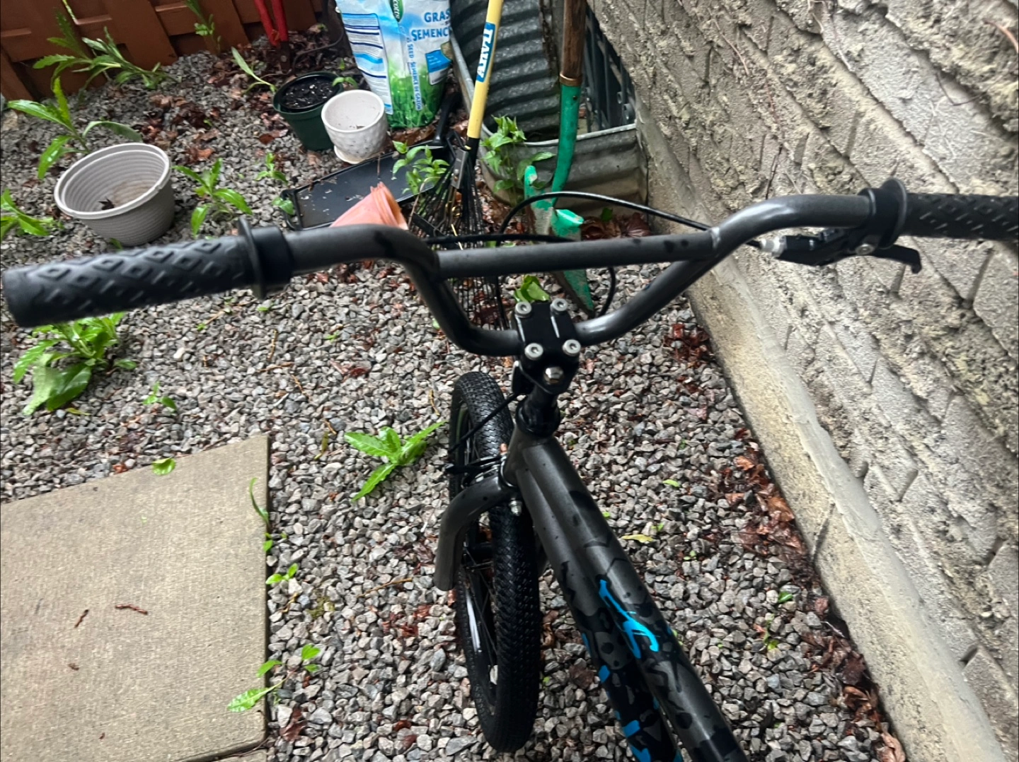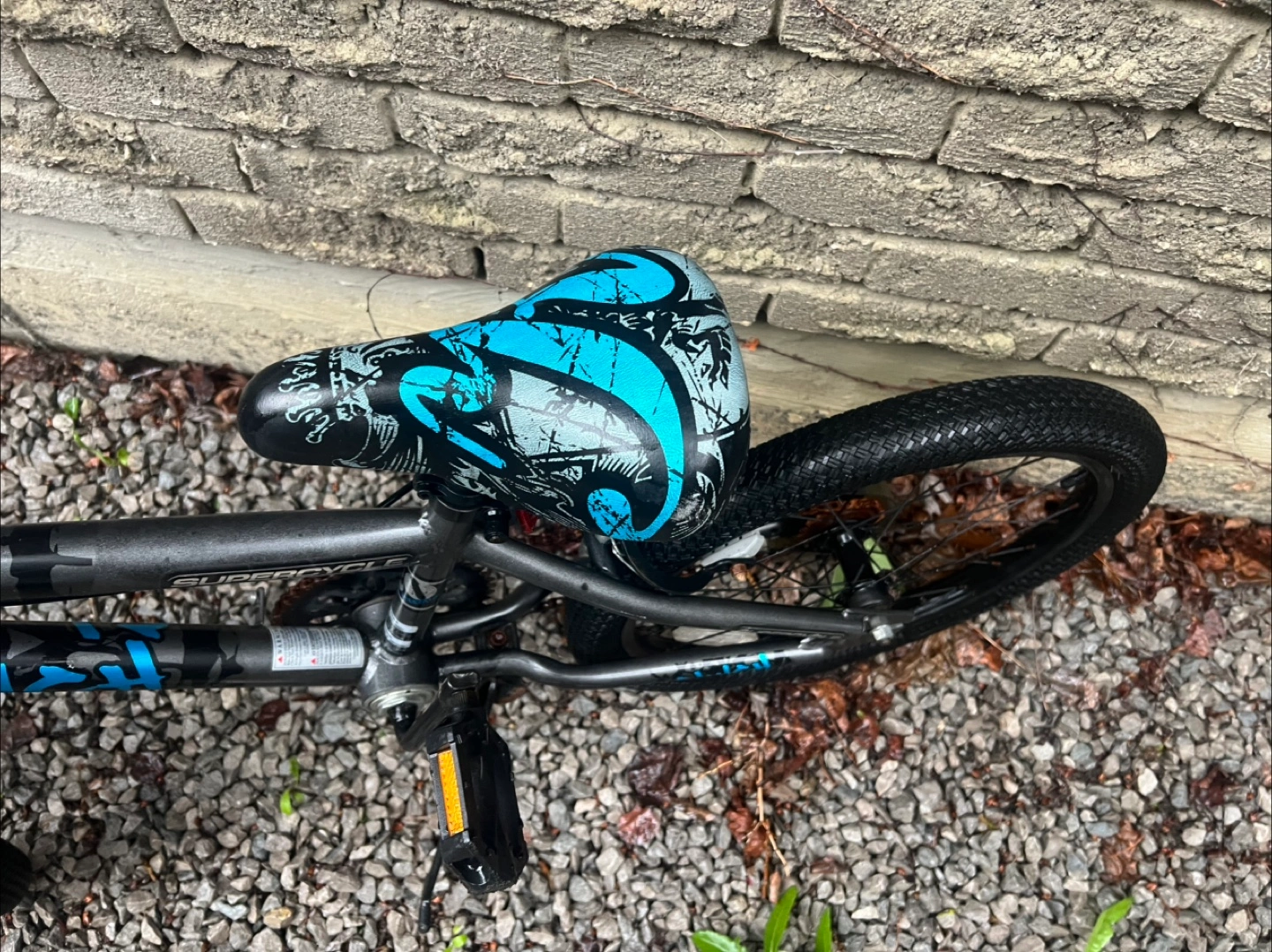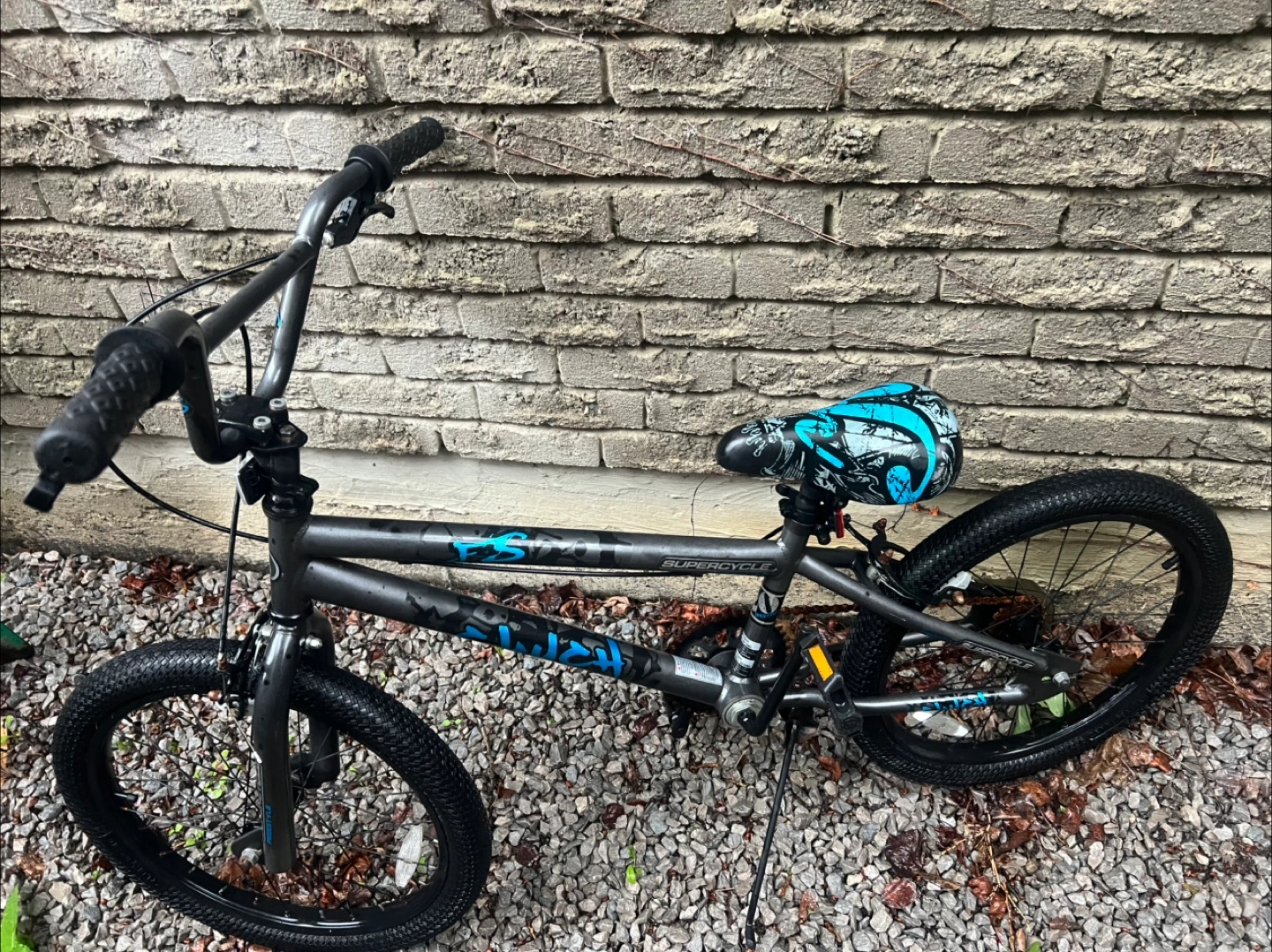 Used boys' BMX bike. Grey and blue colour scheme. 20 inch wheels. Shows some wear.