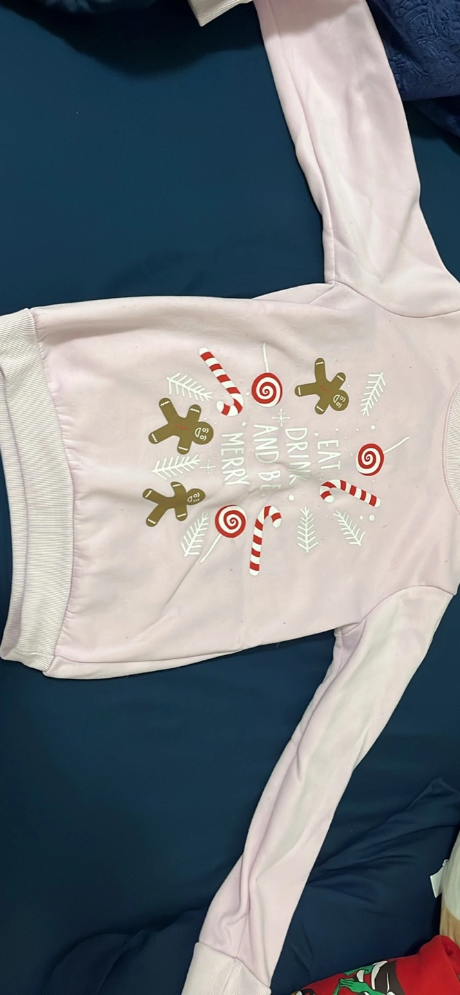 Adorable pink Christmas sweater. Features gingerbread men, candy canes, and the phrase "Eat Drink and Be Merry". Long sleeves, crew neck. Perfect for the holidays.