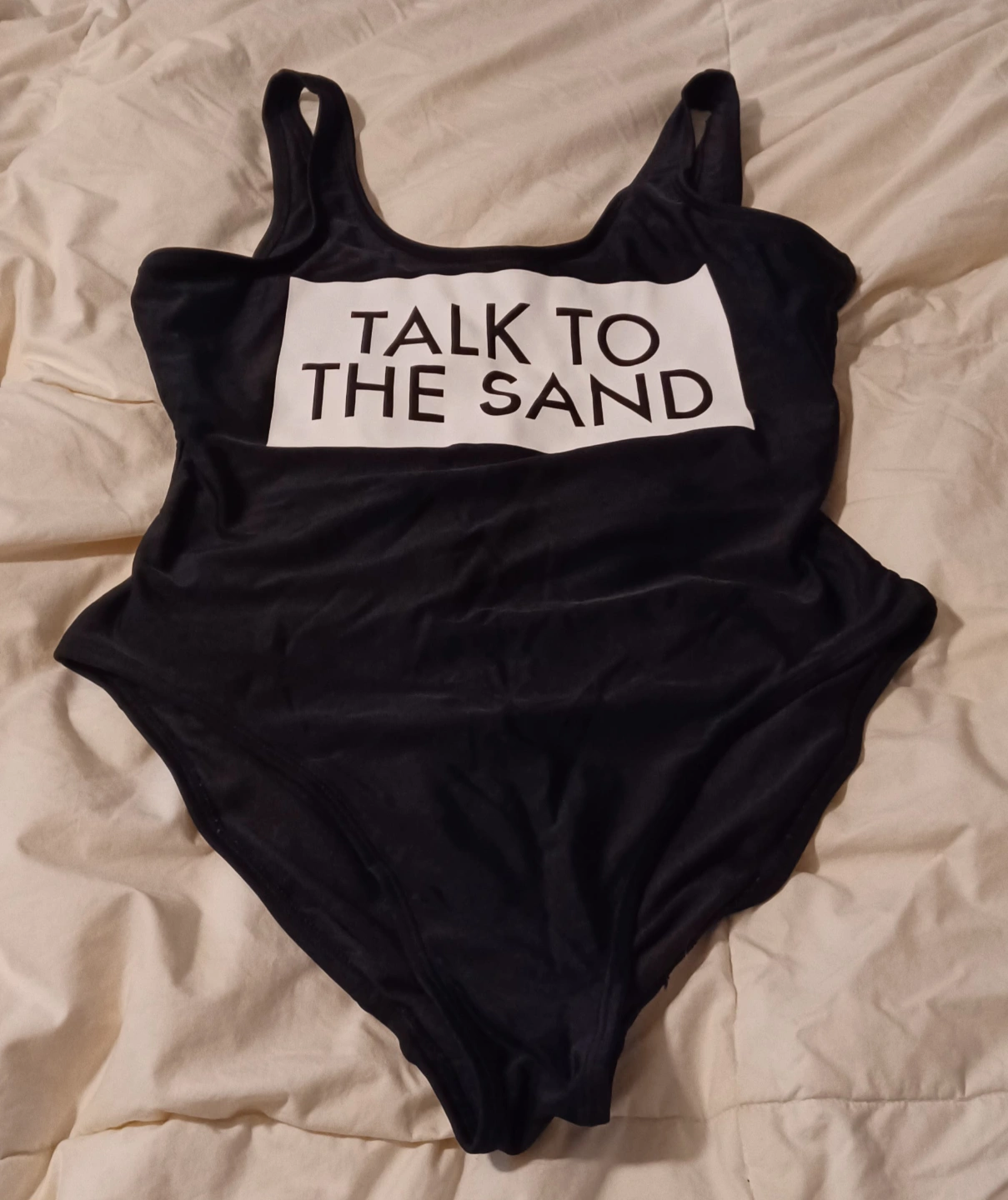 Women's black one-piece swimsuit. Features a white graphic on the front that says "Talk To The Sand". Scoop neck and back. Only worn once for a summer camp field trip.