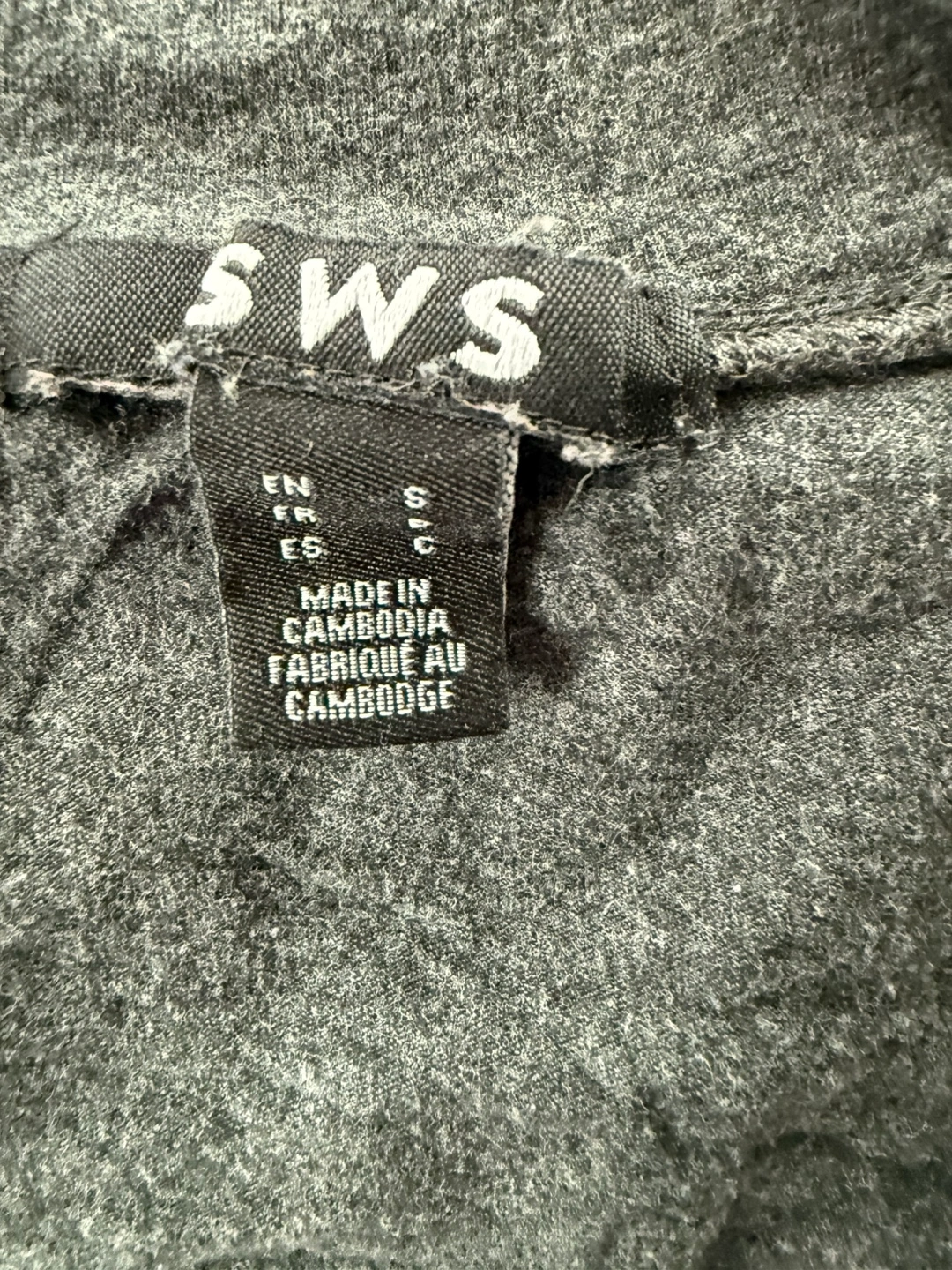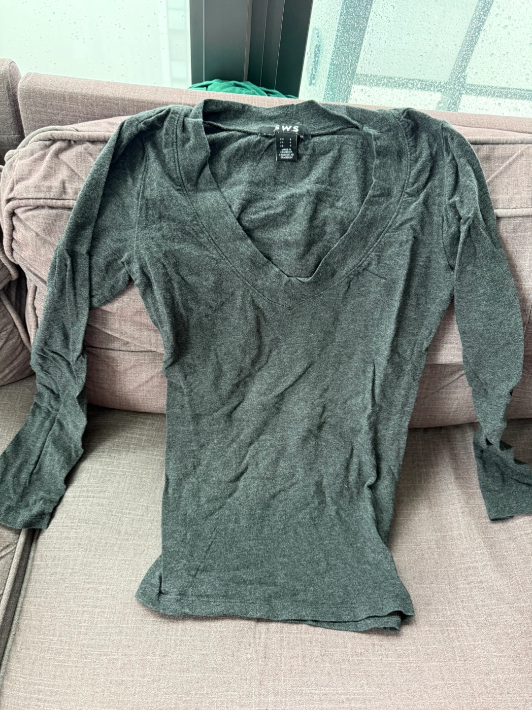 1000+Long sleeve v-neck shirt. Soft material. Charcoal grey colour. Size small. Made in Cambodia.