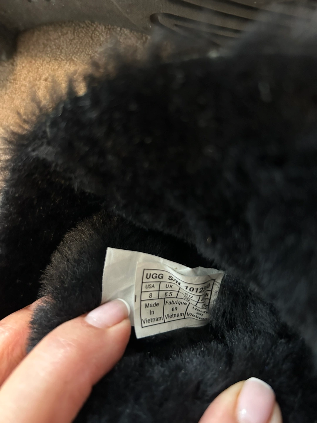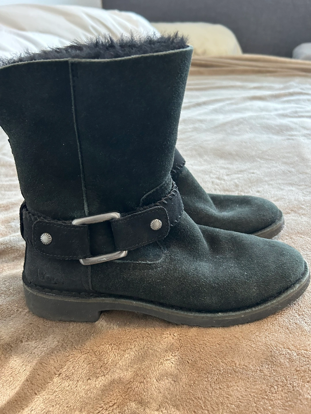 Women's black suede UGG boots. Size 8. Features a buckle detail. Excellent condition.