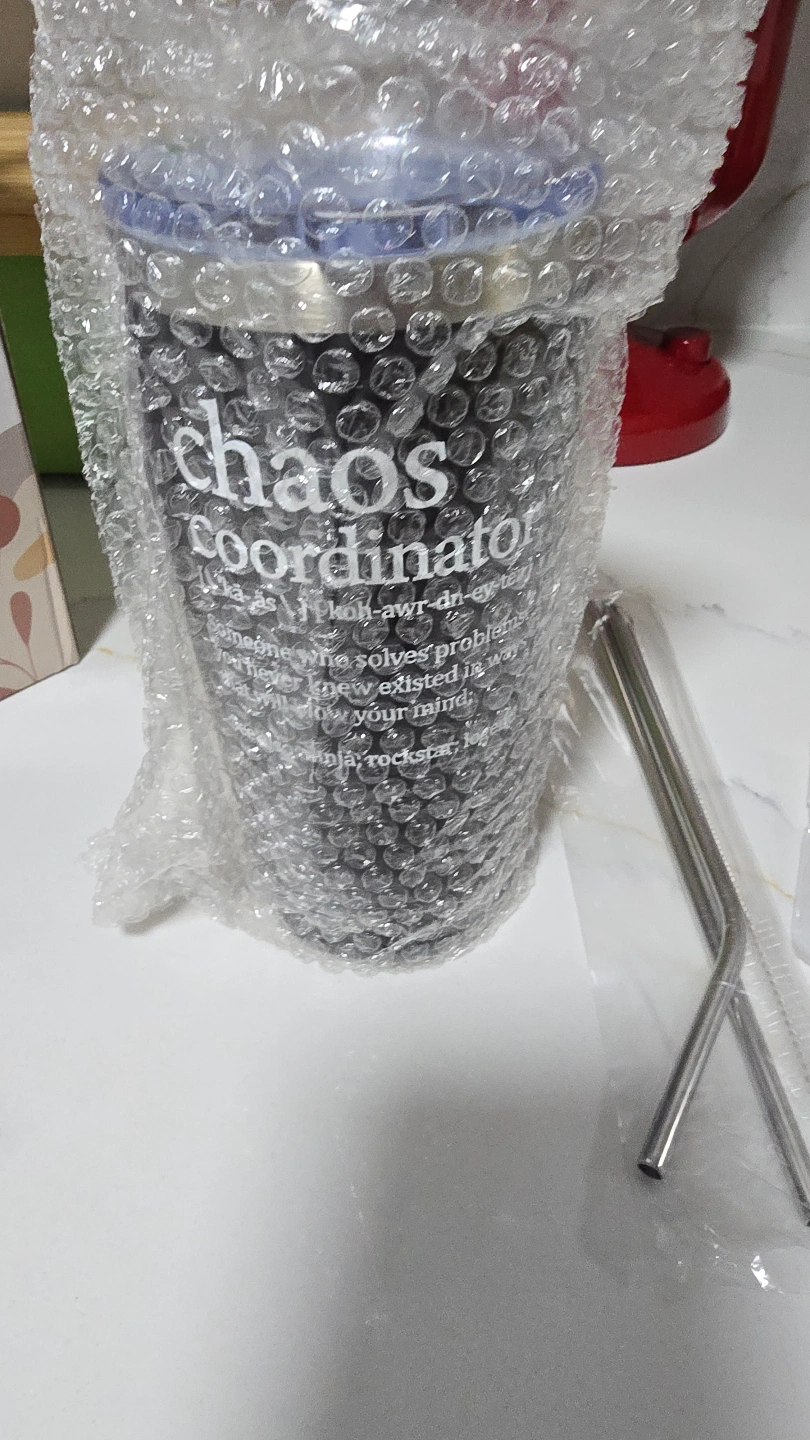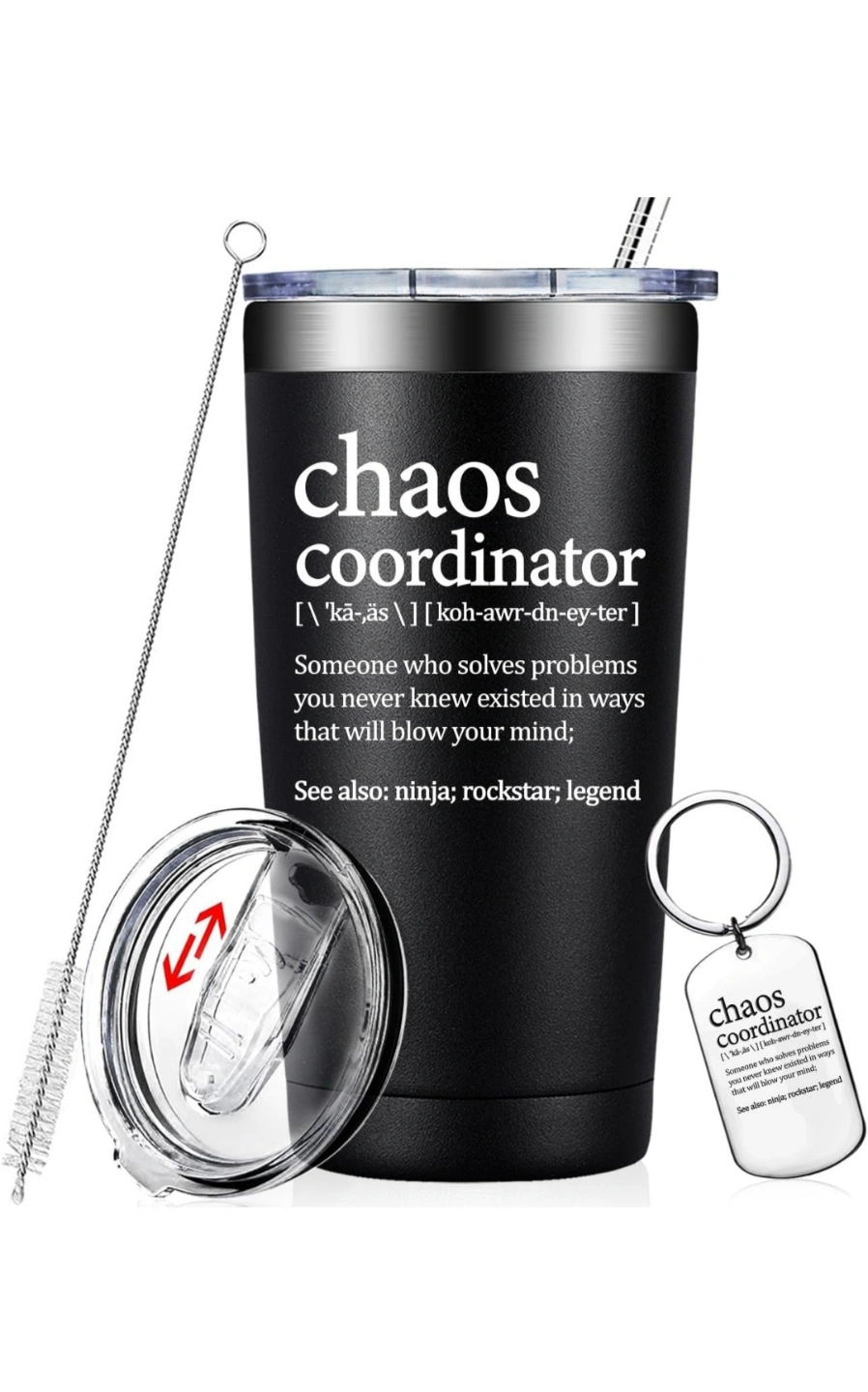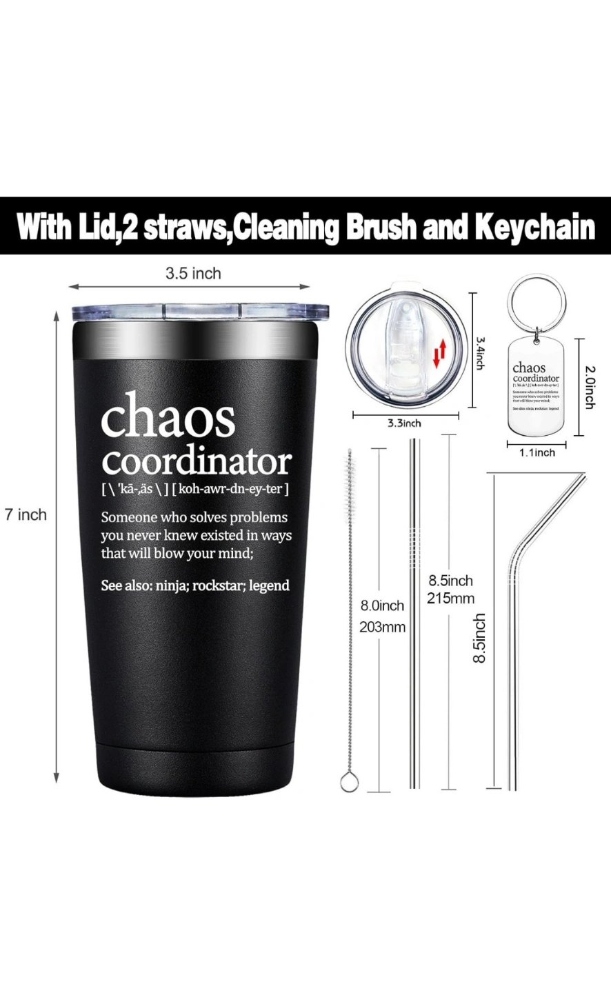 New stainless steel tumbler. Features humorous 'Chaos Coordinator' definition. Includes two metal straws, cleaning brush, and matching keychain. Lid included. Comes in original box.