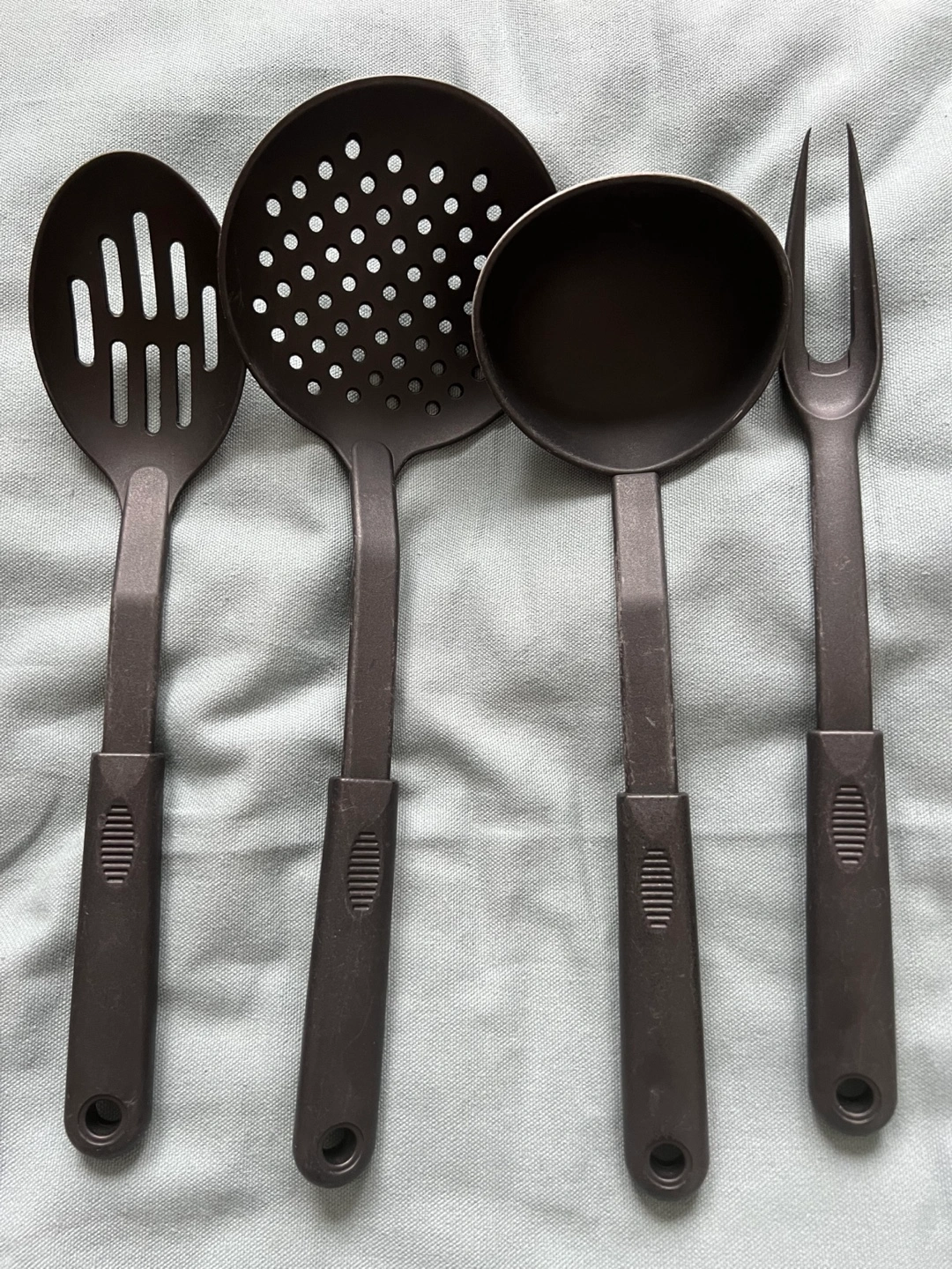 Set of four black nylon kitchen utensils. Includes slotted spoon, slotted spatula, ladle, and serving fork. In good condition.
