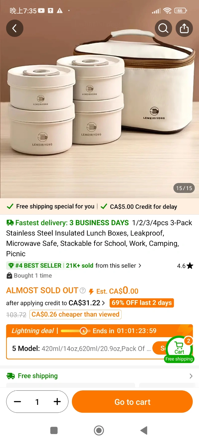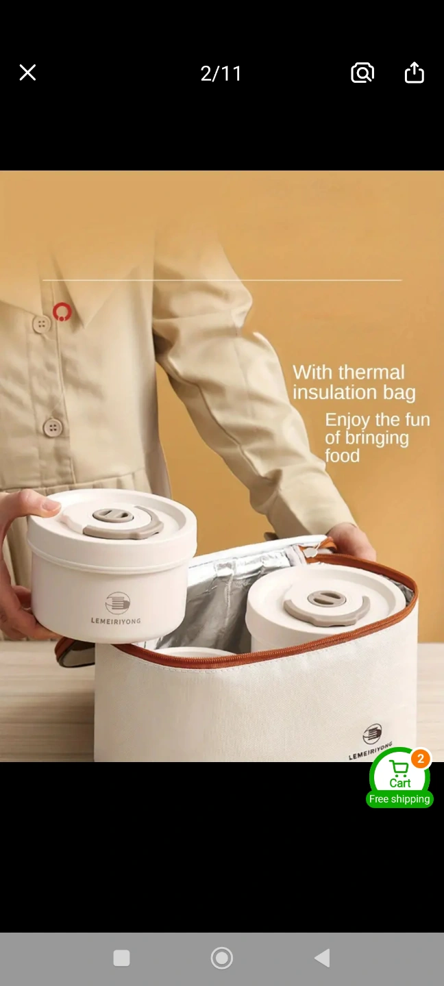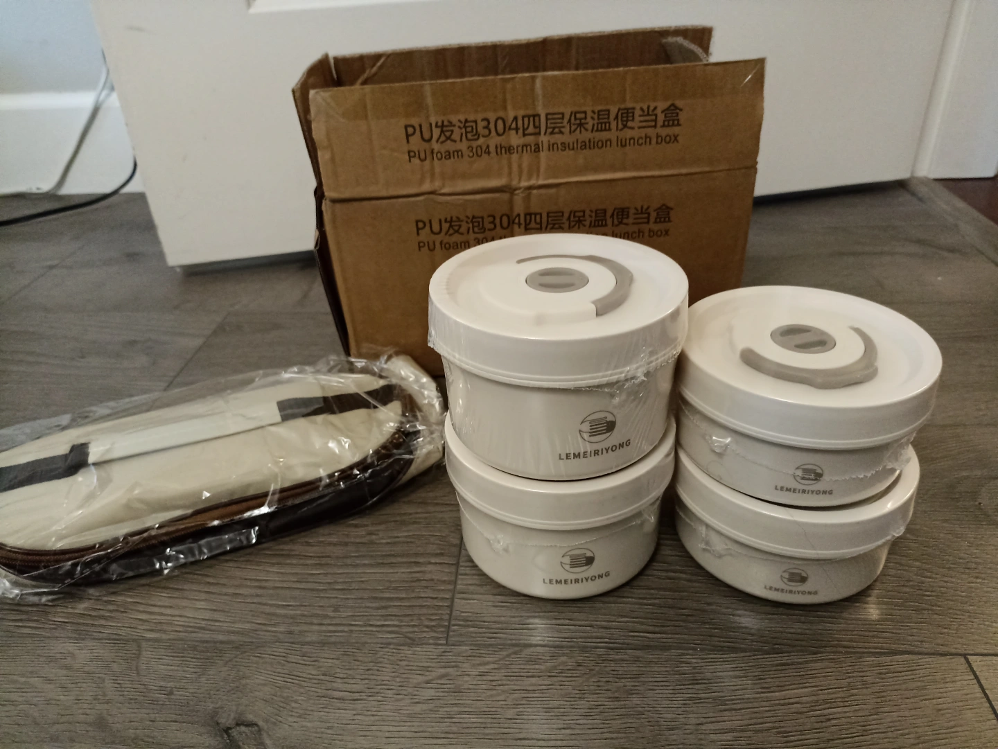Set of four stainless steel insulated lunch boxes. Microwave safe, leakproof, stackable. Includes carrying case. Perfect for school, work, or picnics