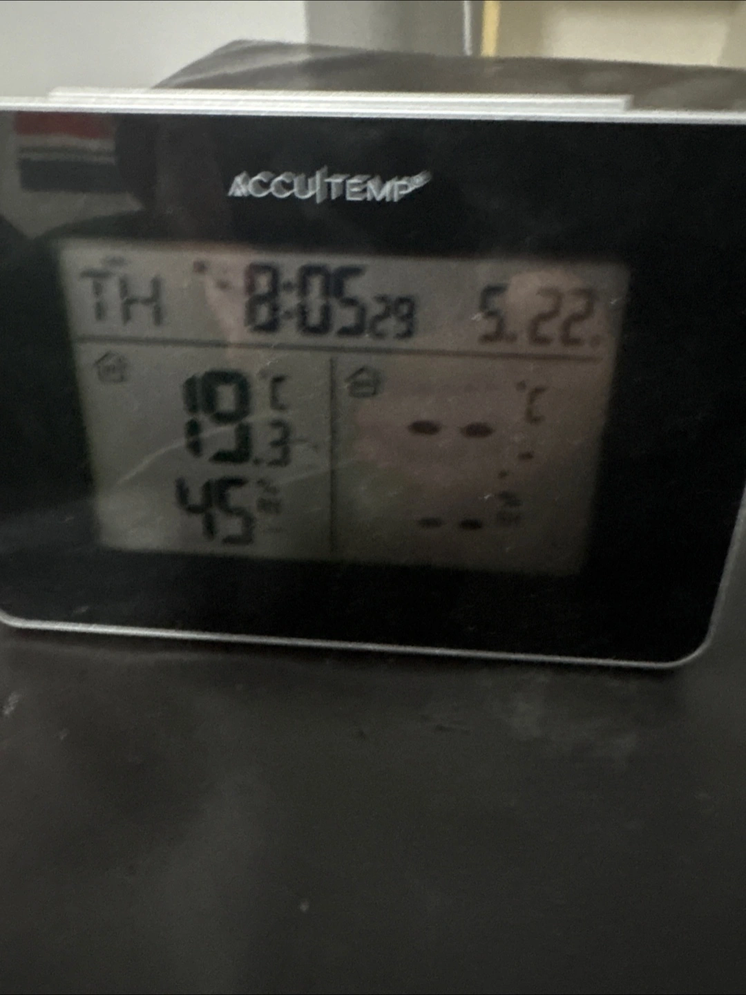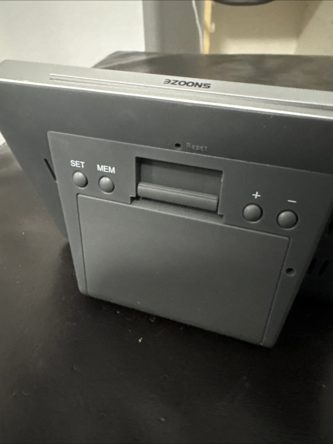 41Digital clock and thermometer. Displays time, temperature in Celsius and Fahrenheit. Features include snooze and memory functions. Battery compartment on the back.
