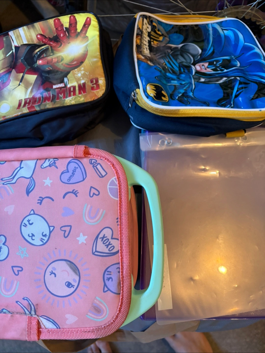 ' lunch bags. Two feature superhero designs (Iron Man and Batman). One is pink with a unicorn and other cute designs. One is a larger insulated tote bag, grey and beige. Great for school or outings.each 5$