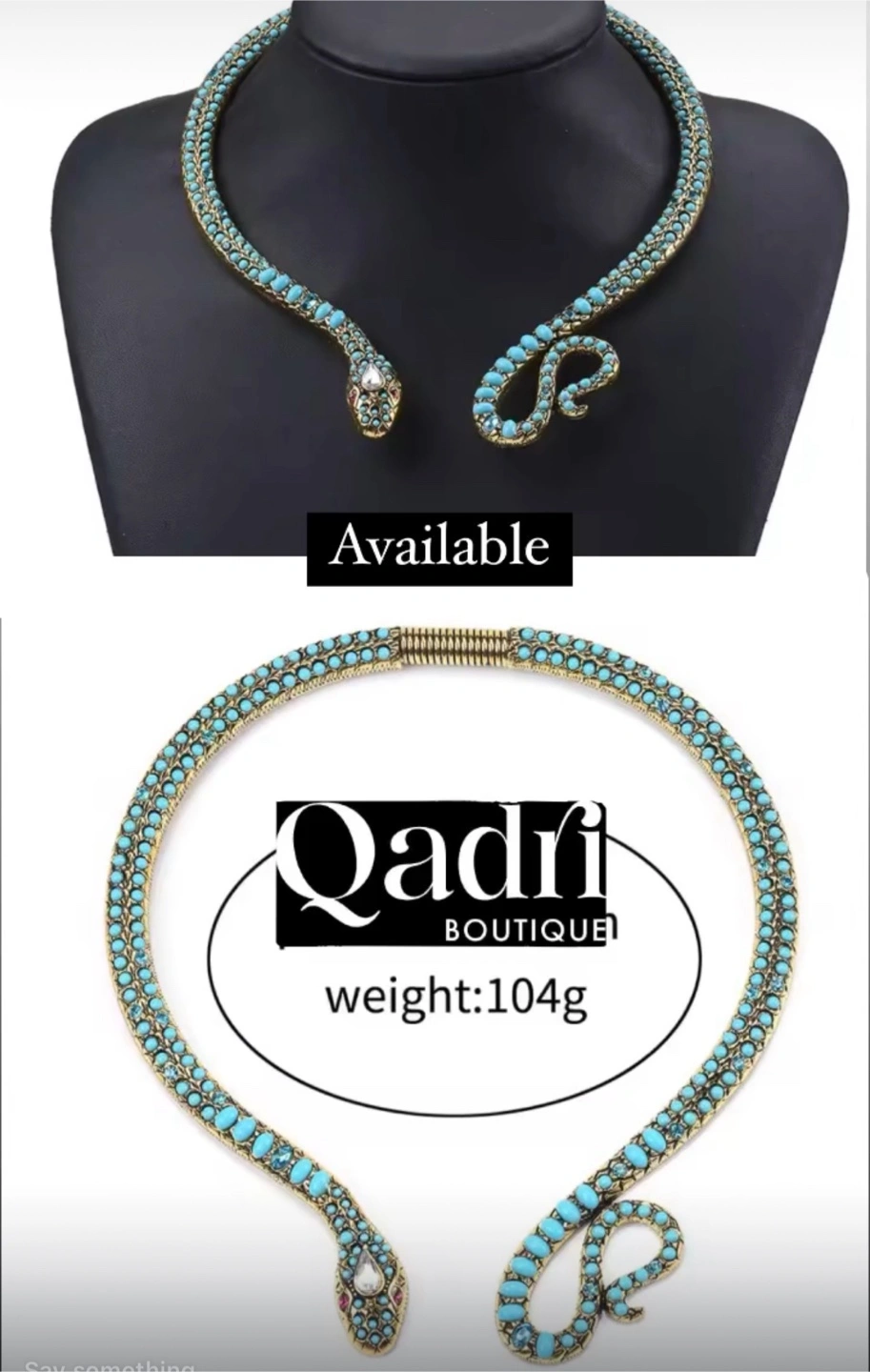 Beautiful statement necklace. Features two snakes. Light teal/turquoise stones. Gold-tone metal. Unique design. Weighs 104g.