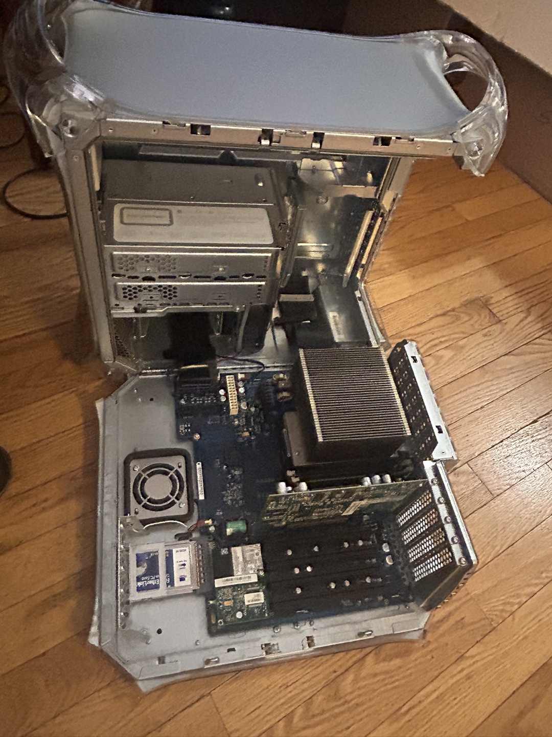 Vintage Apple Power Mac G4 Cube. Clear Perspex case. Internal components visible. Great for collectors or enthusiasts. Sold as is.
