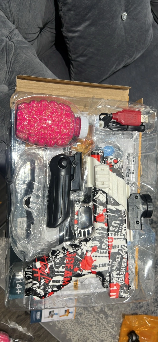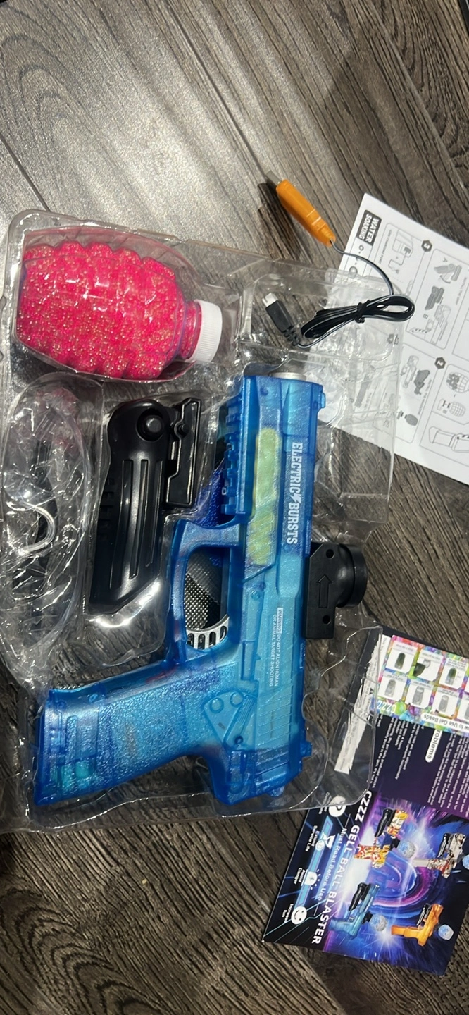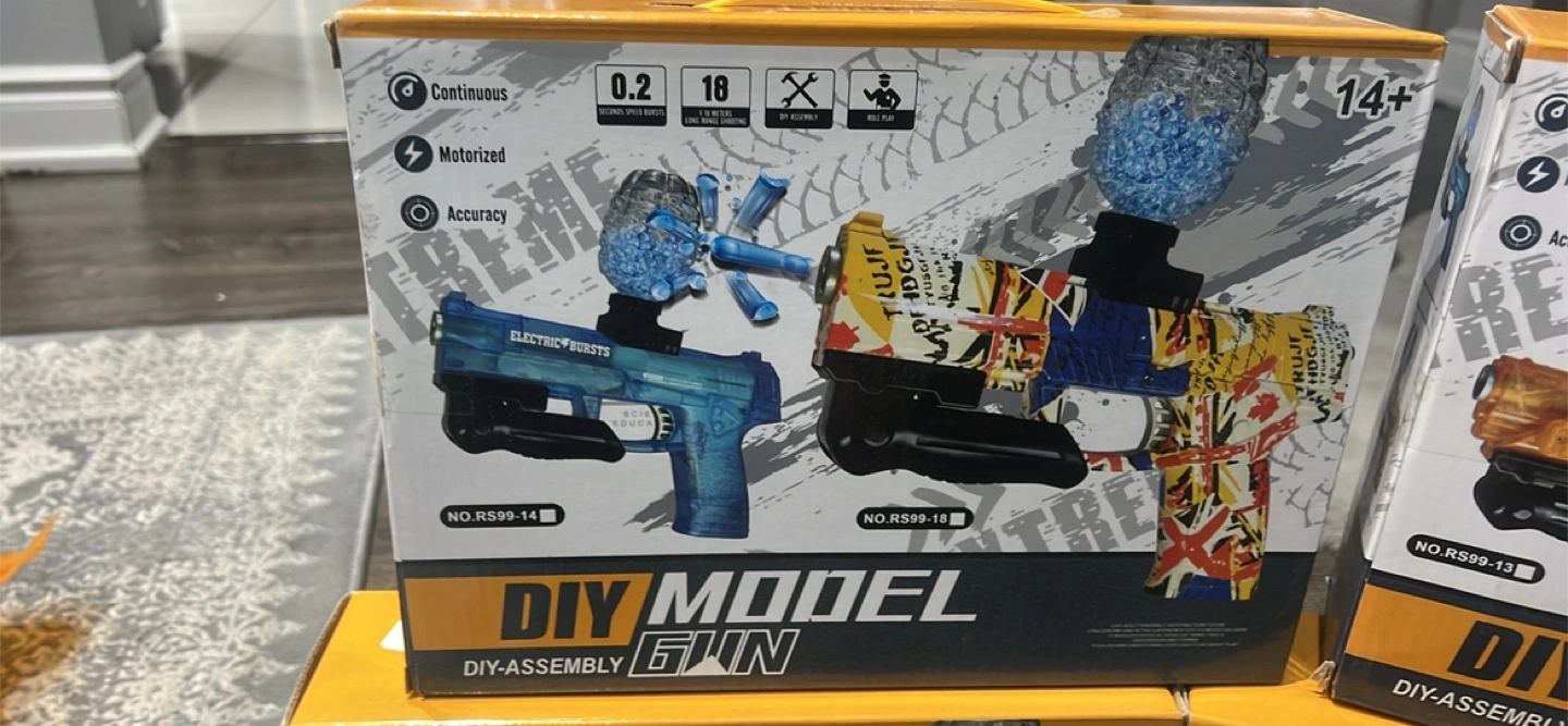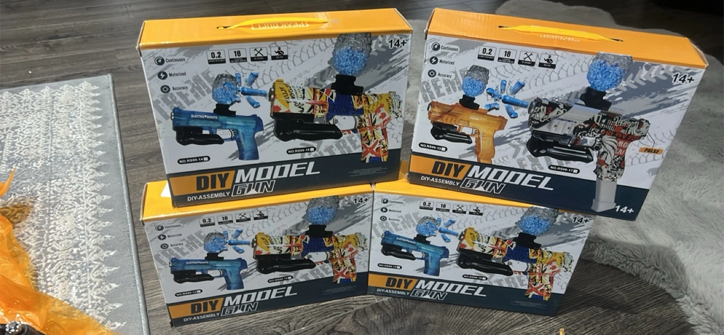 Four new, unopened DIY model gel ball blasters. Ages 14+. Motorized, continuous fire. Shoots gel balls up to 18 meters. Includes extra gel balls. Requires assembly. 100 pcs available