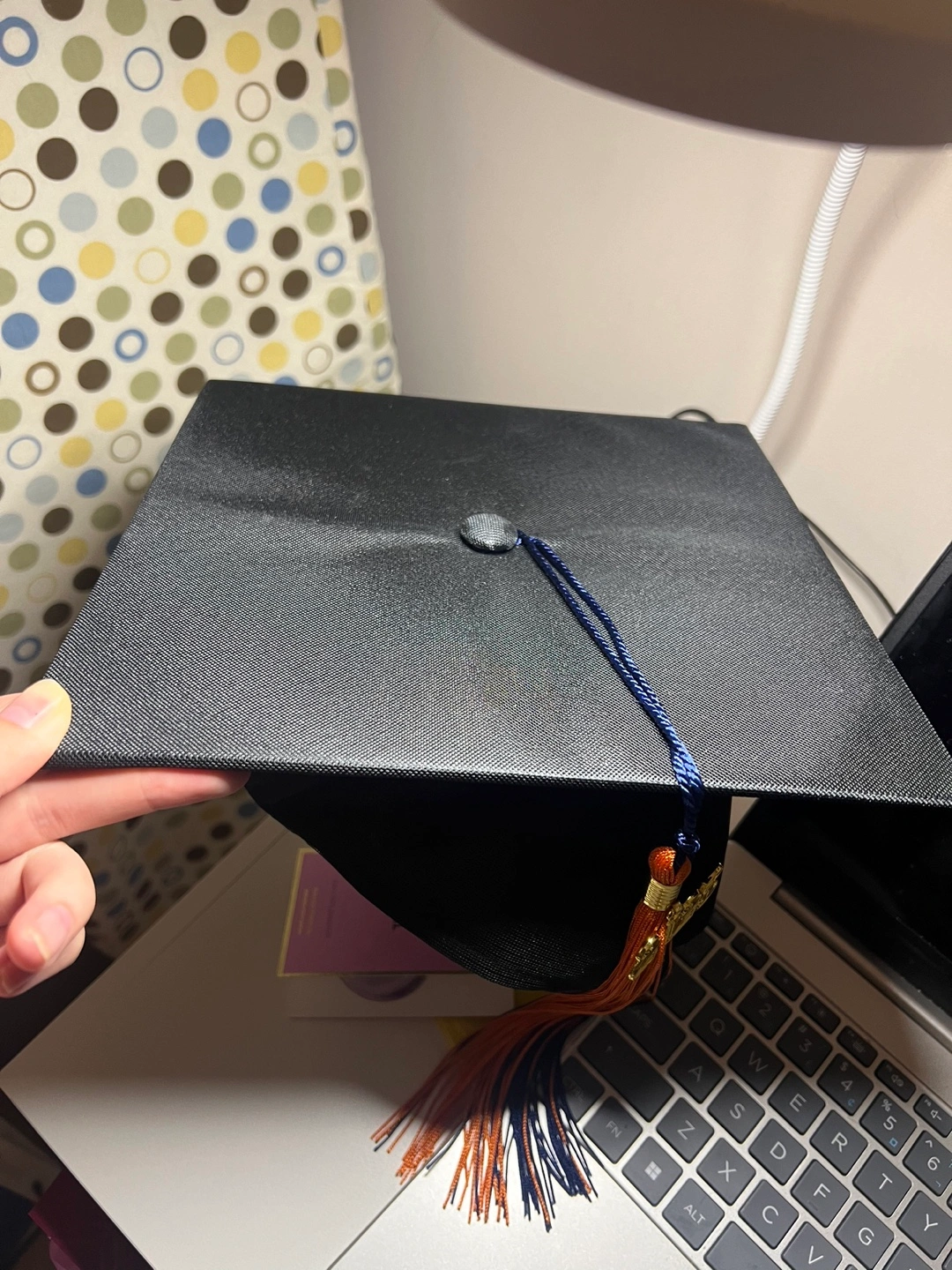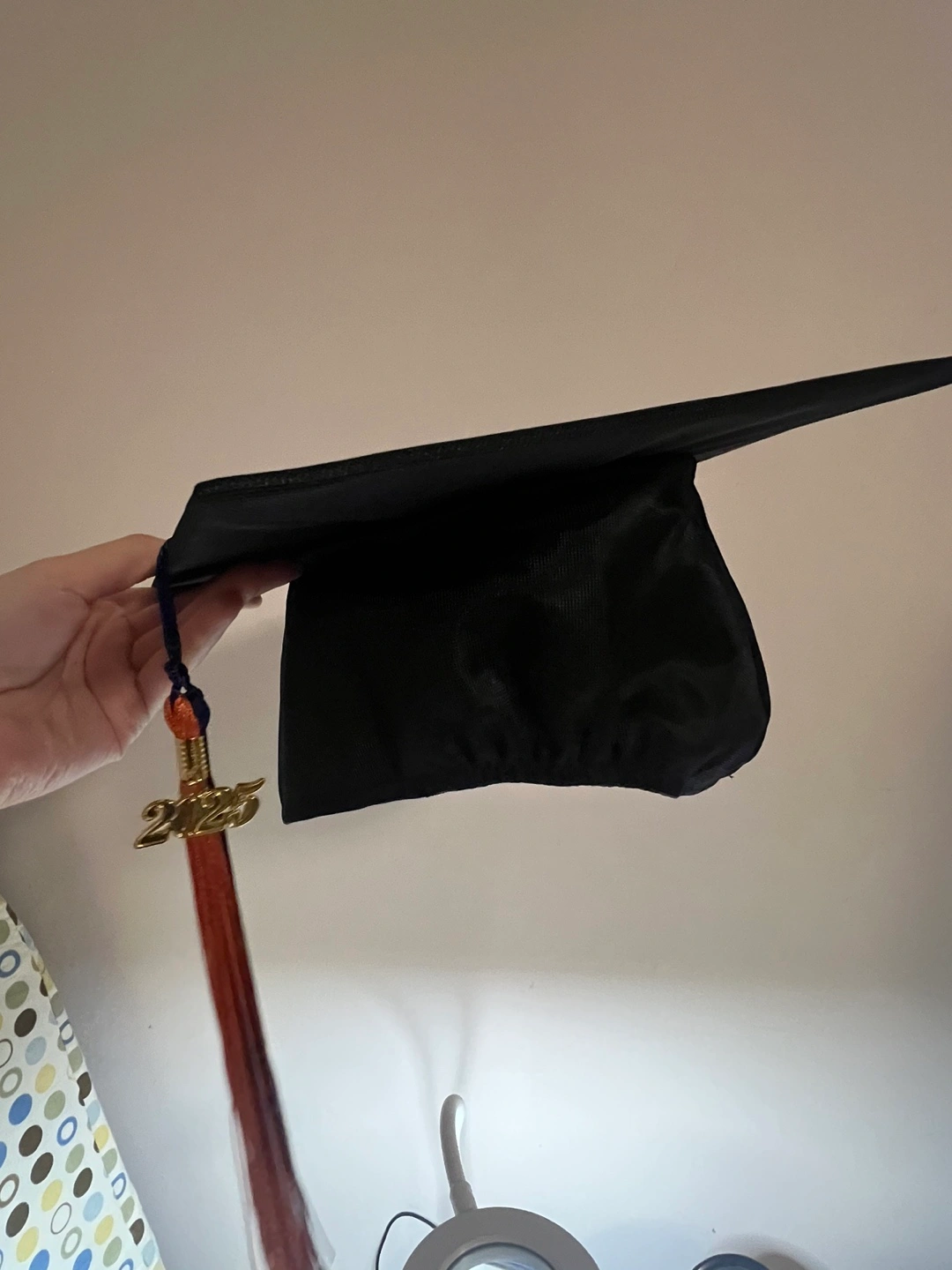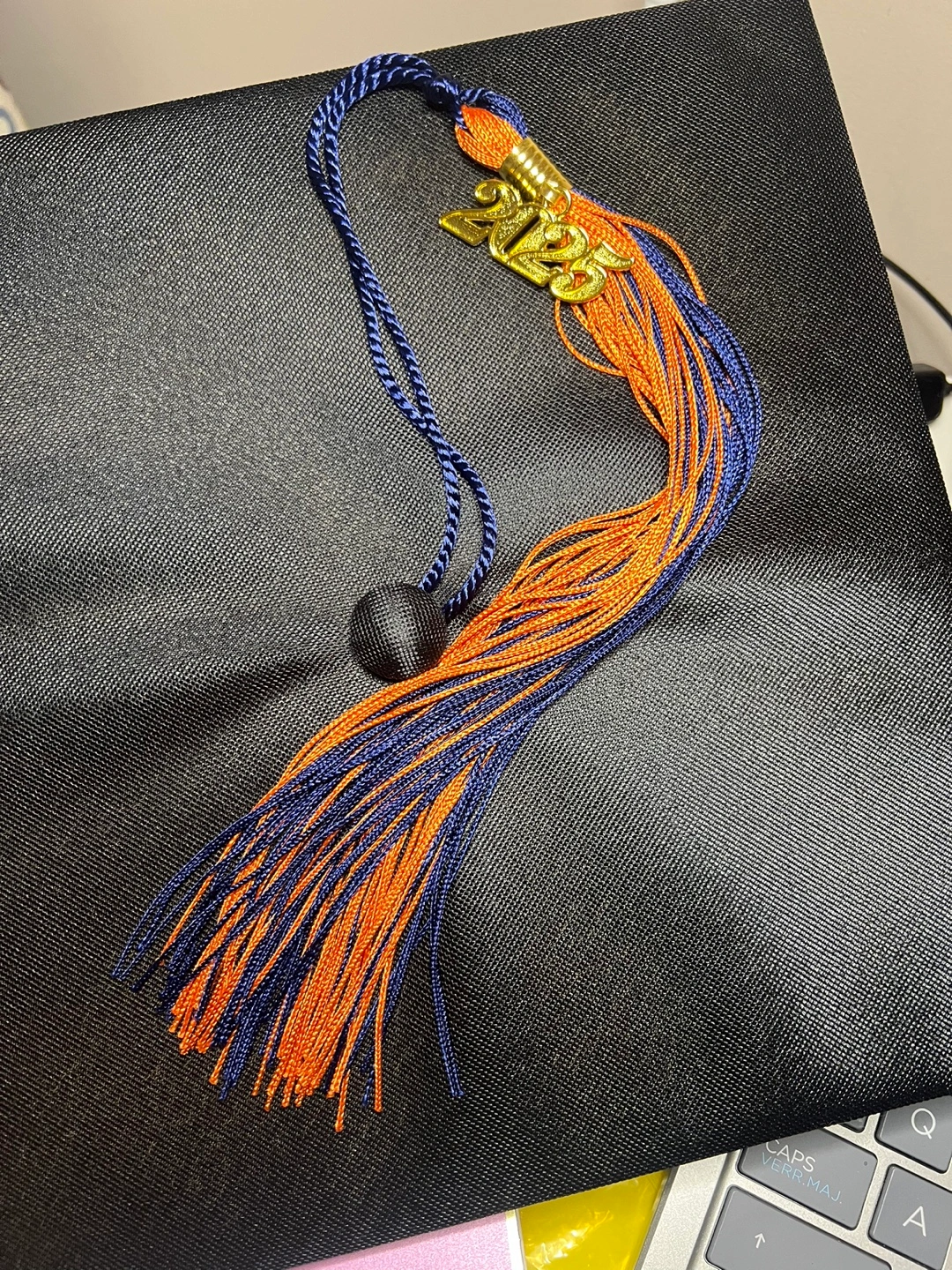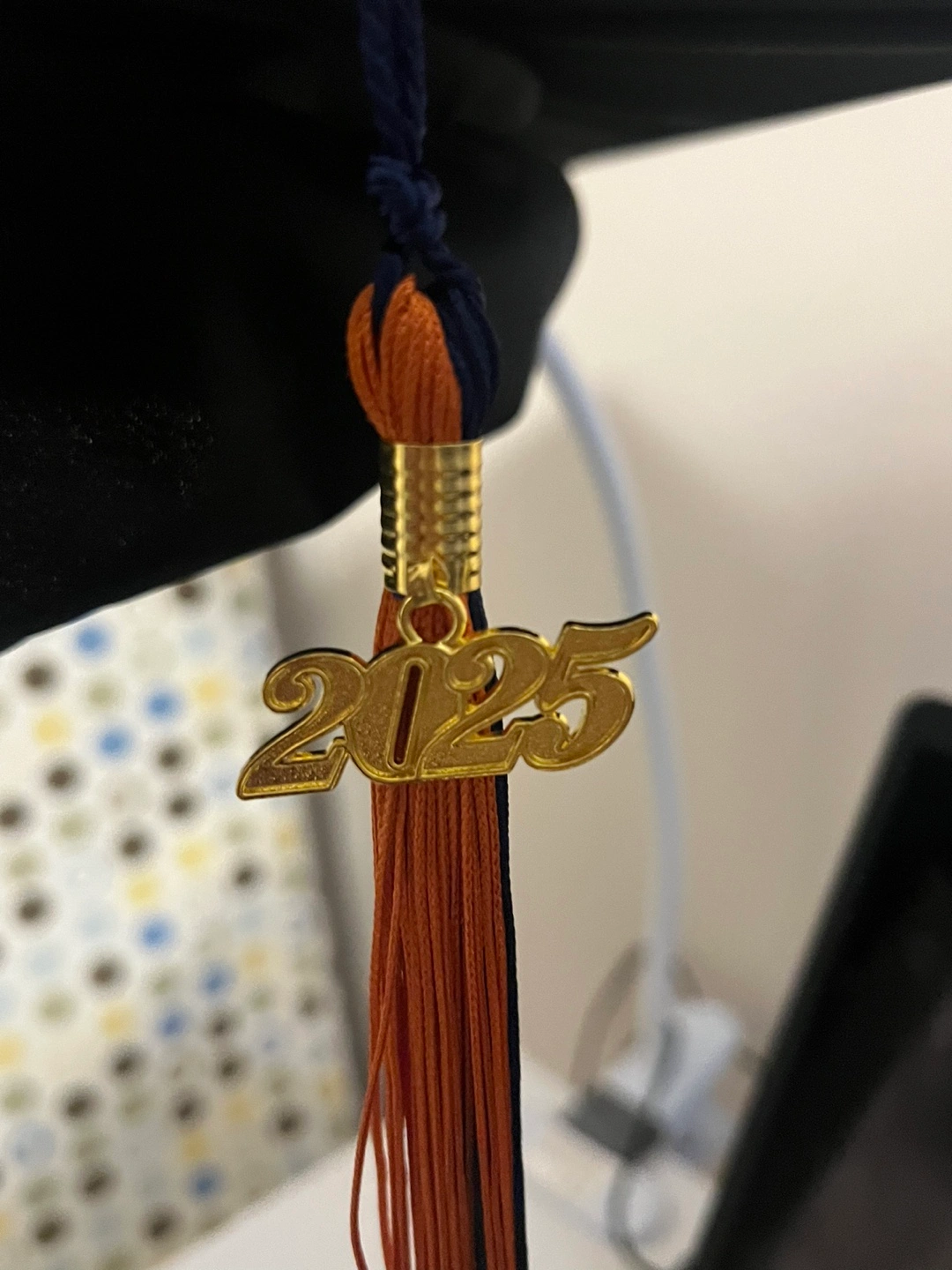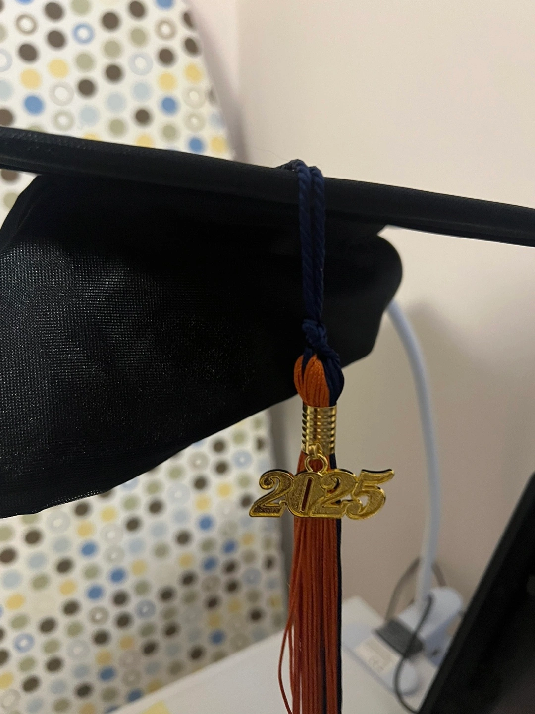 Brand new, never worn Black graduation cap and 2025 tassel in dark blue and orange. Tassel removable.