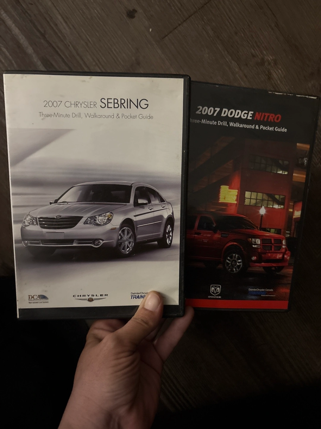 195Pair of vehicle manuals. Three-minute drill, walkaround and pocket guides. Good condition. One for a 2007 Chrysler Sebring and one for a 2007 Dodge Nitro. Pick up only