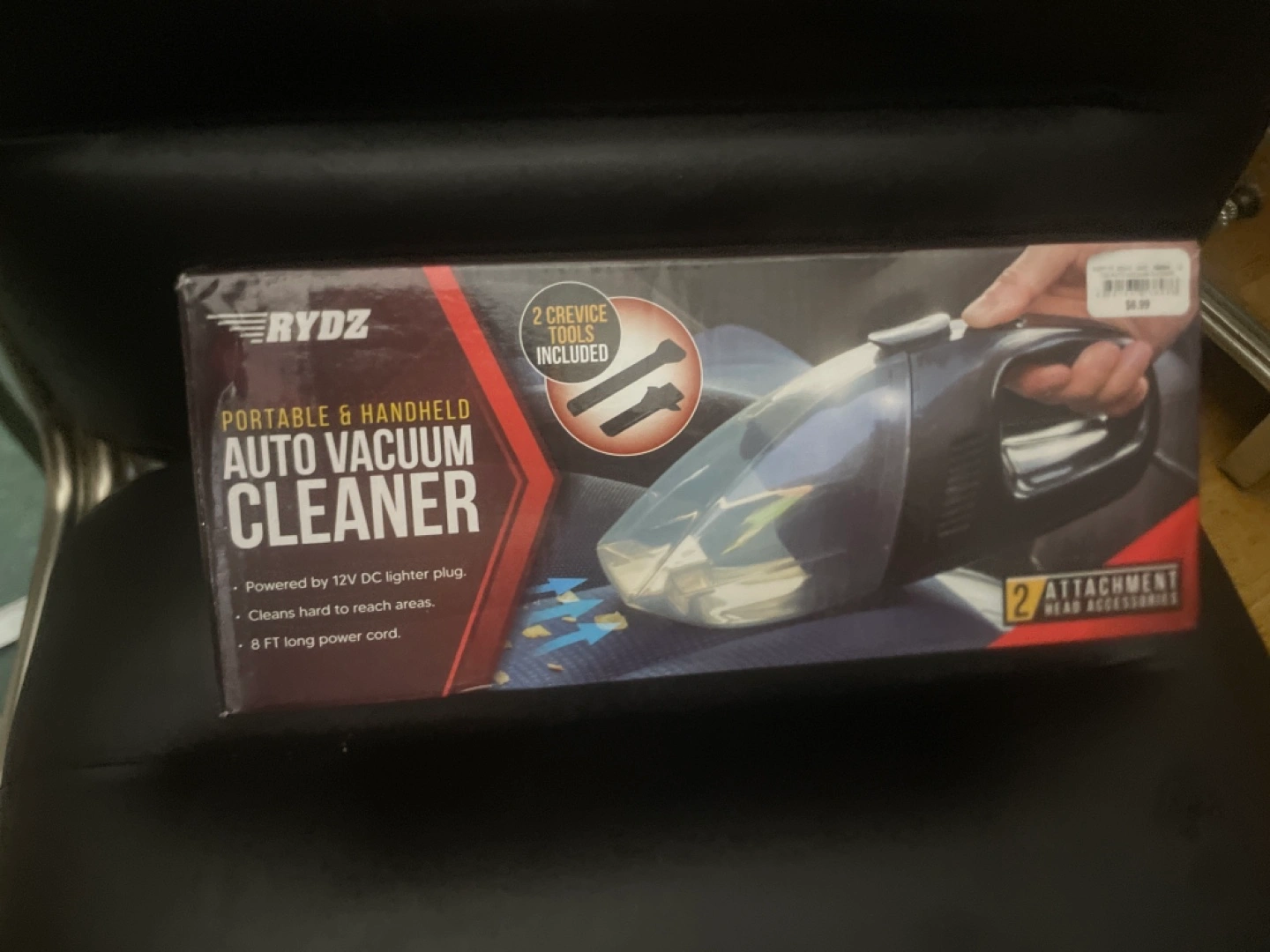 Portable handheld auto vacuum cleaner. Powered by 12V DC lighter plug. Cleans hard to reach areas. 8 ft long power cord. Includes two crevice tools.