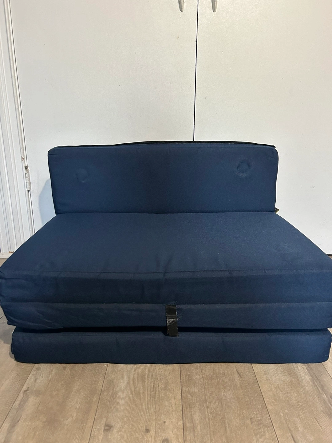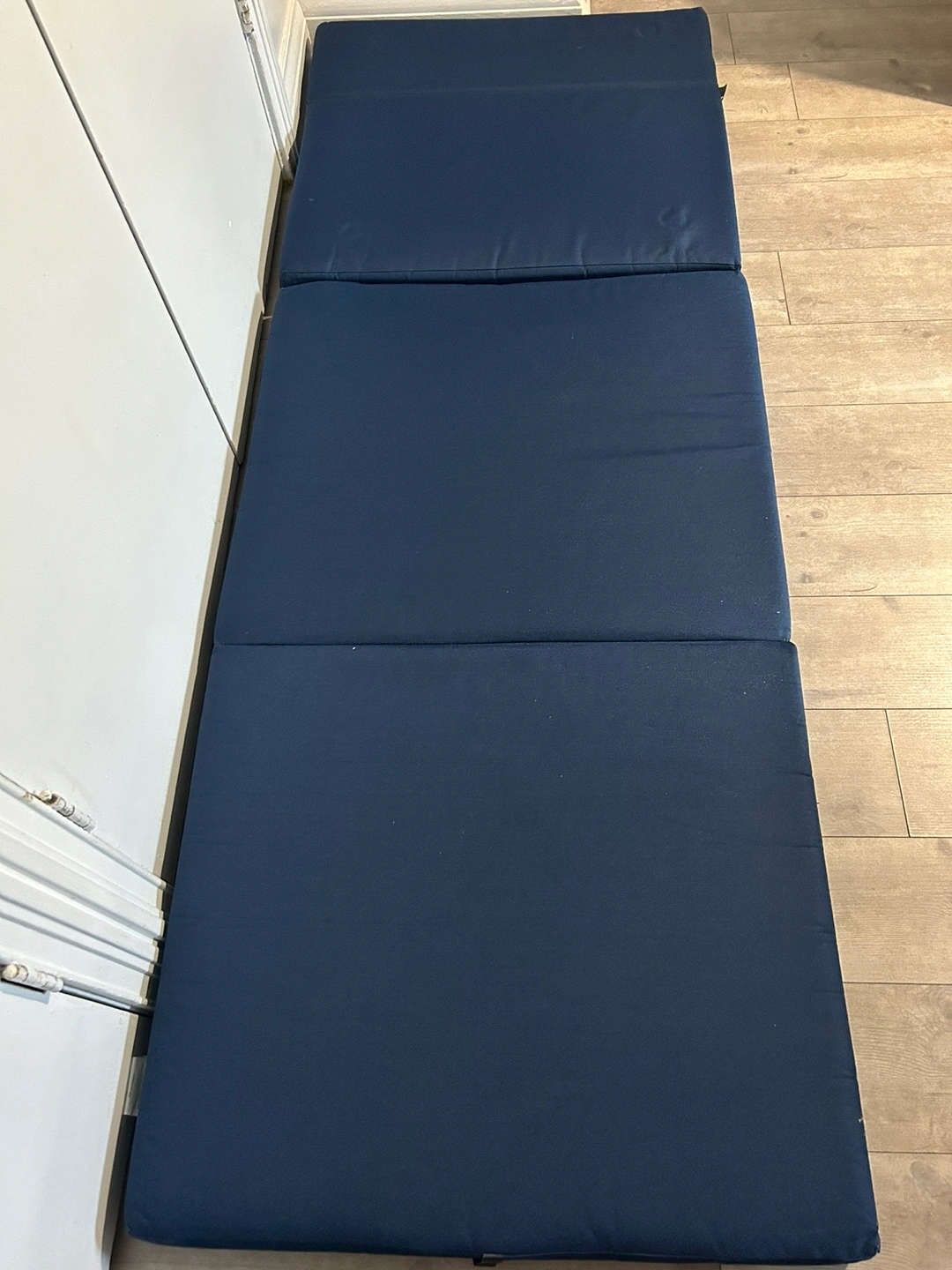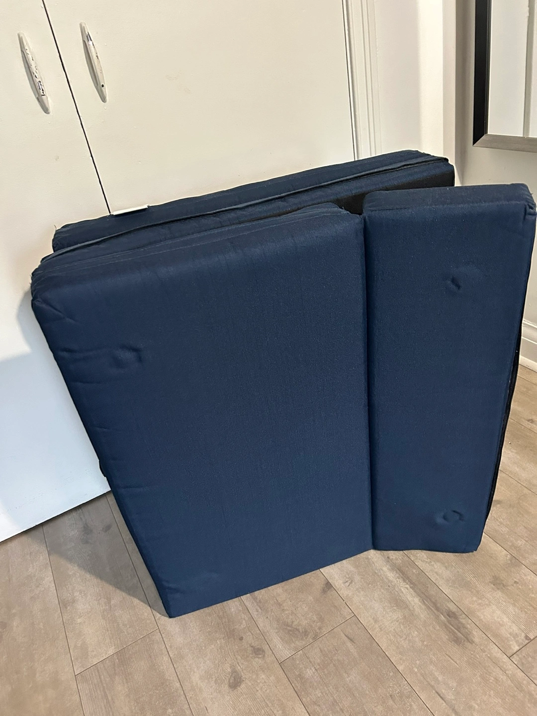 Navy blue foldable mattress. Three sections. Folds easily for storage. Suitable for guests or extra sleeping space.