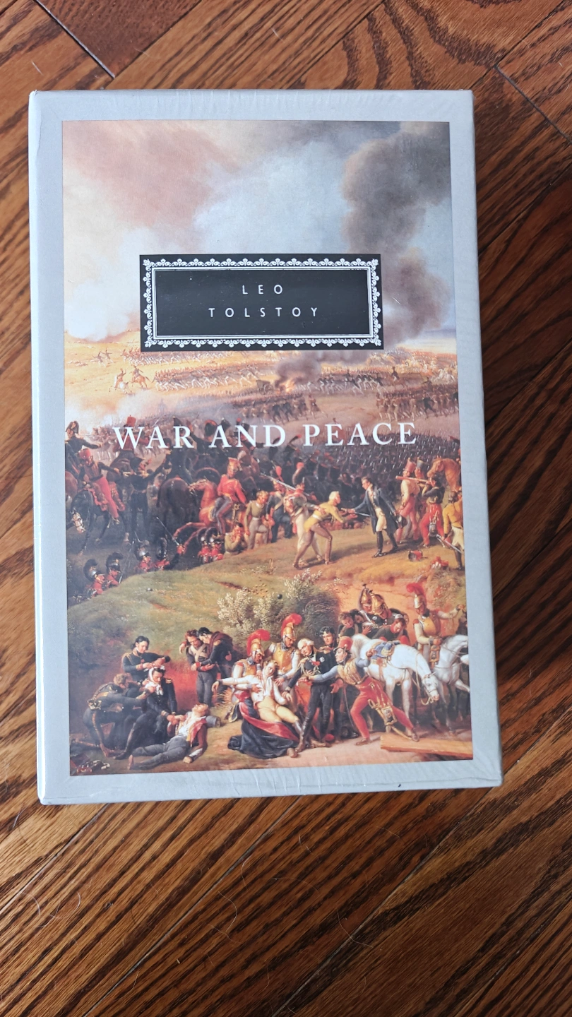 Three-volume set of Leo Tolstoy's War and Peace. Everyman's Library edition. New and sealed. current MSRP 99.99+tax on Amazon Location: Vaughan (Bathurst/Rutherford) , or Downtown Toronto (Fort York area) no shipping, cash only.