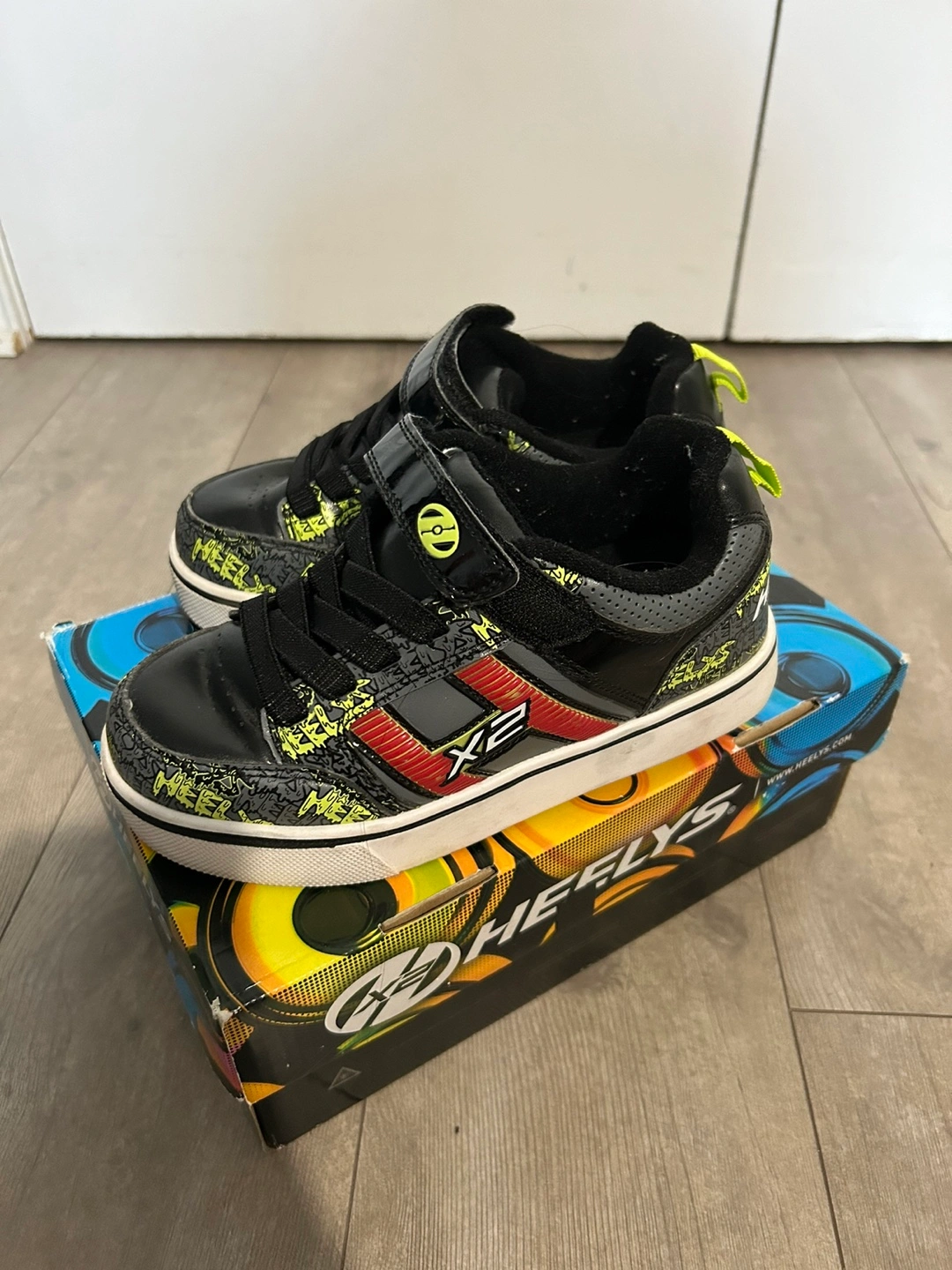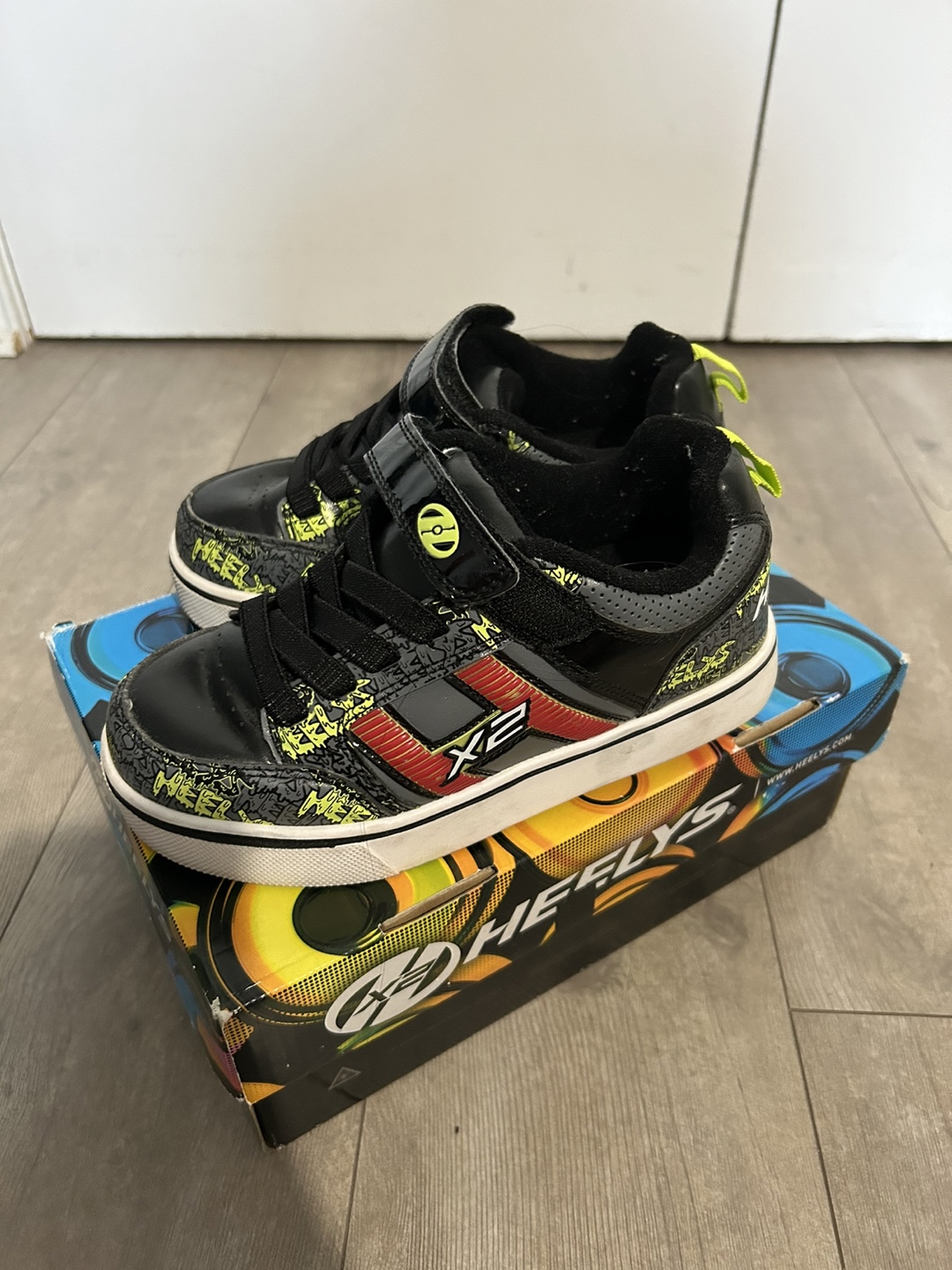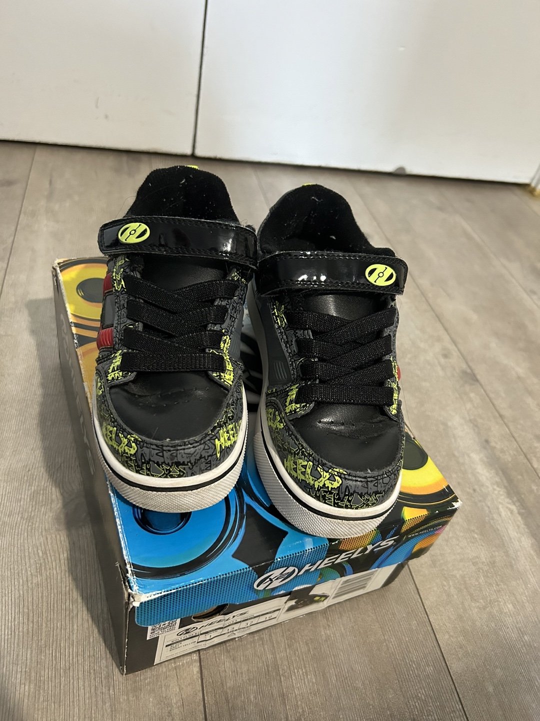 Heelys X2 kids' sneakers. Black with graffiti print. Size 11. Velcro and lace closure. Good condition.