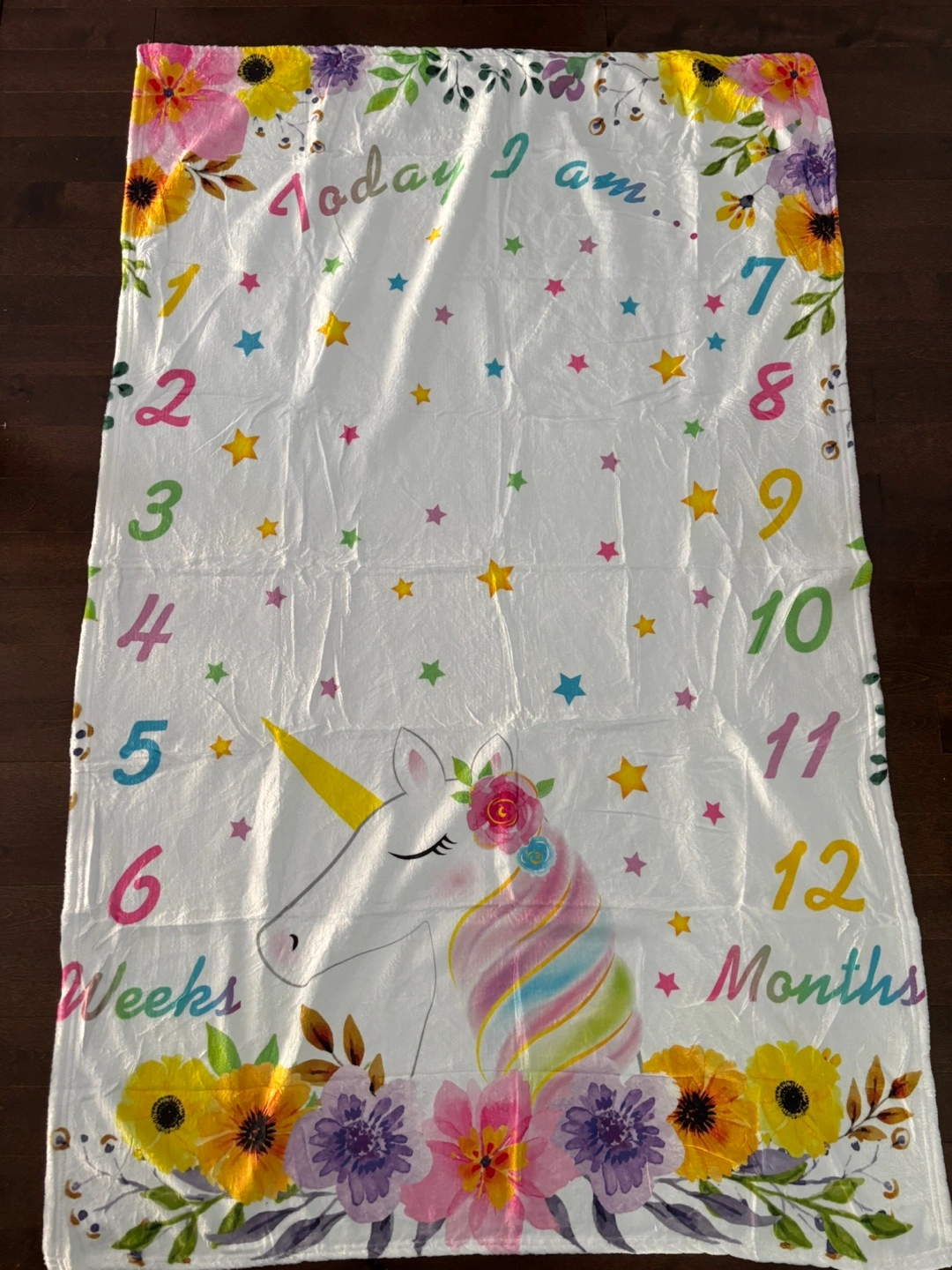 Adorable baby milestone blanket. Features a cute unicorn design, floral accents, and numbers 1-12 months and weeks. Soft material, perfect for photos.