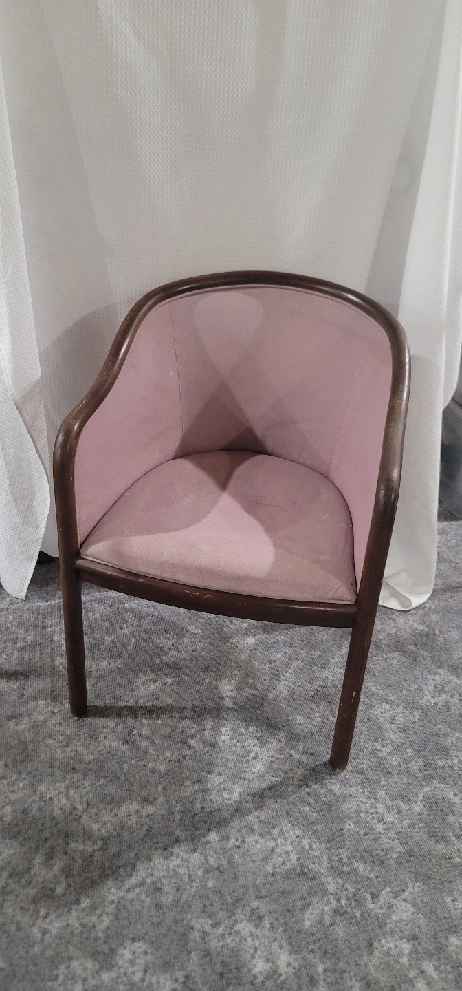 Small armchair. Dark brown wooden frame. Light pink upholstery. Suitable for a child or small adult.