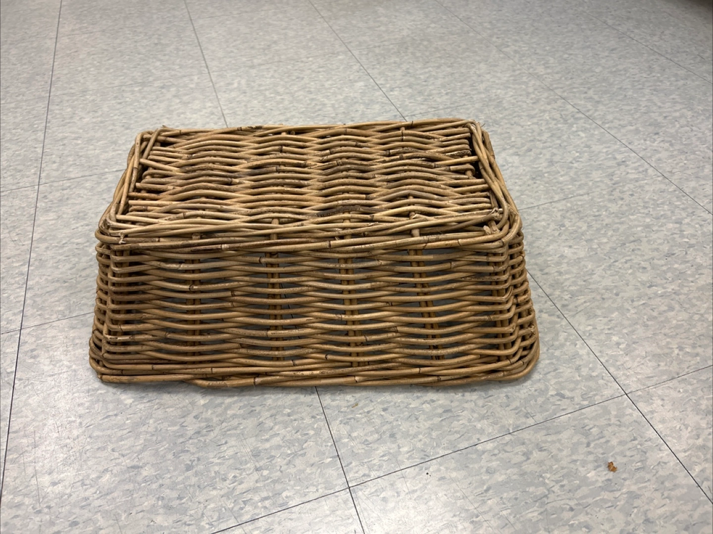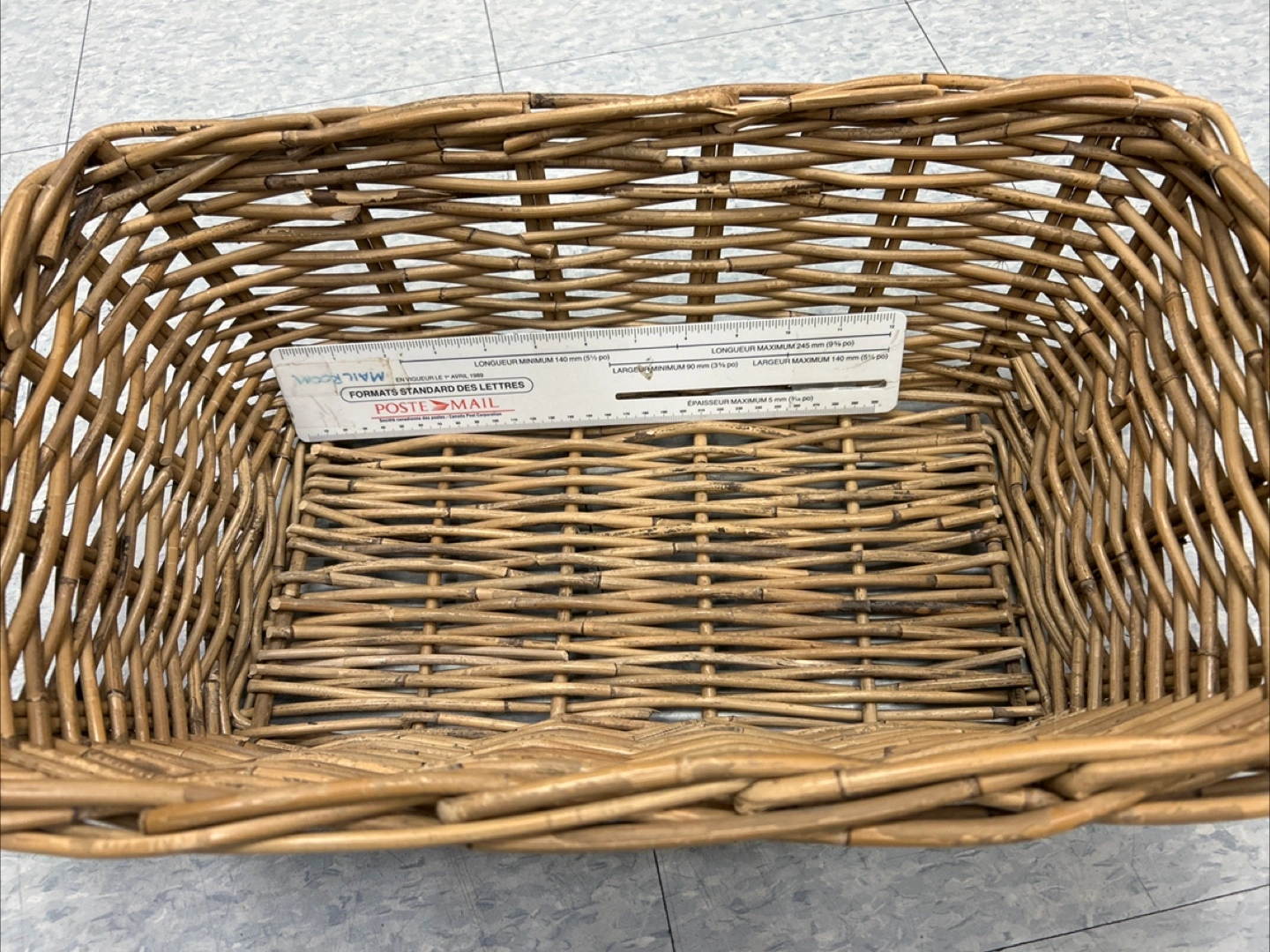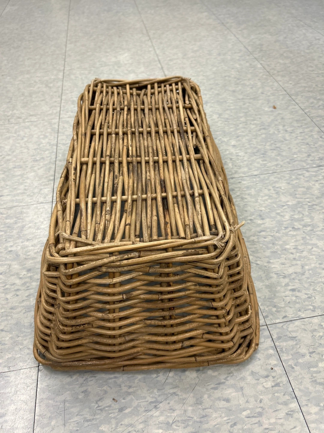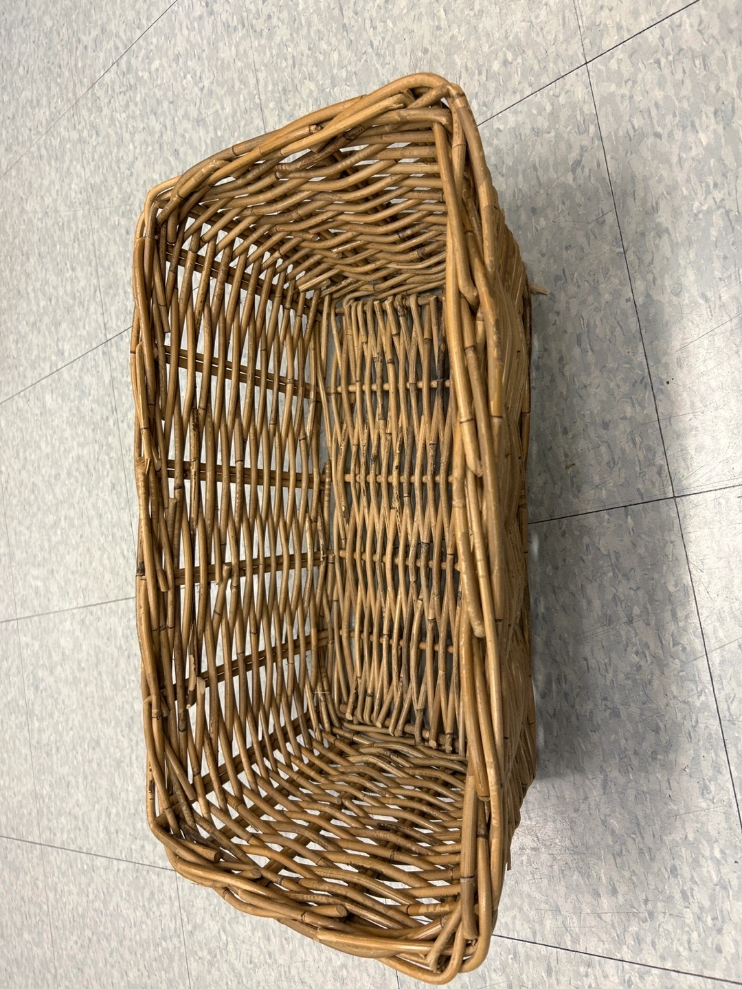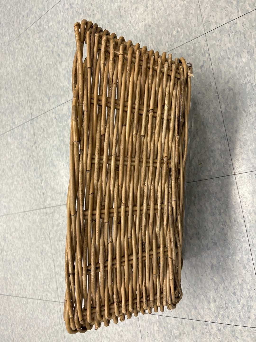 Spacious rectangular wicker basket. Ideal for storage or organization. Fancy for planting as well. Natural light brown colour. Sturdy construction.
