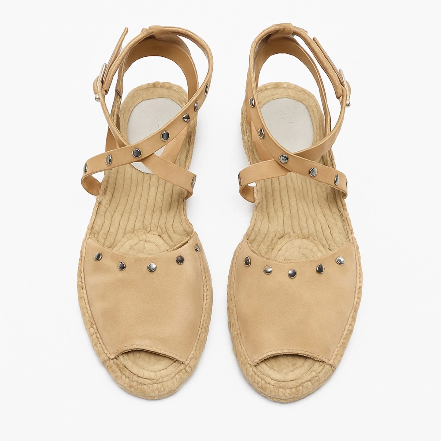 Pair of beige leather espadrille sandals. Ankle straps with studs. Open toe. Slight heel. Worn couple times. Moving Sale