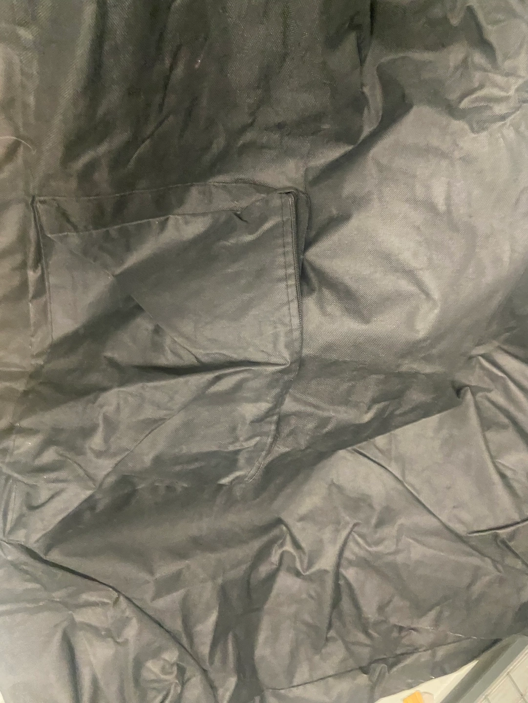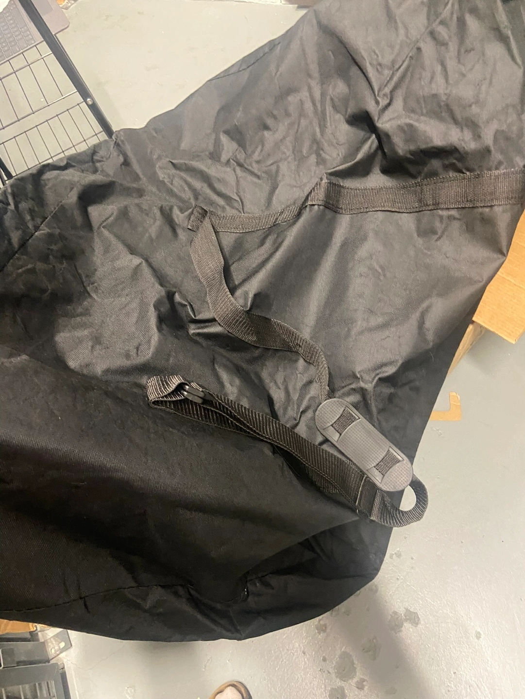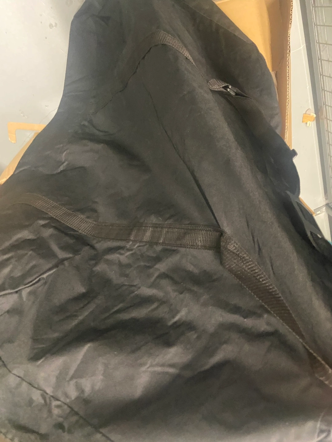 Black nylon massage table carrying bag. Zipper closure and shoulder straps. Includes small pocket.