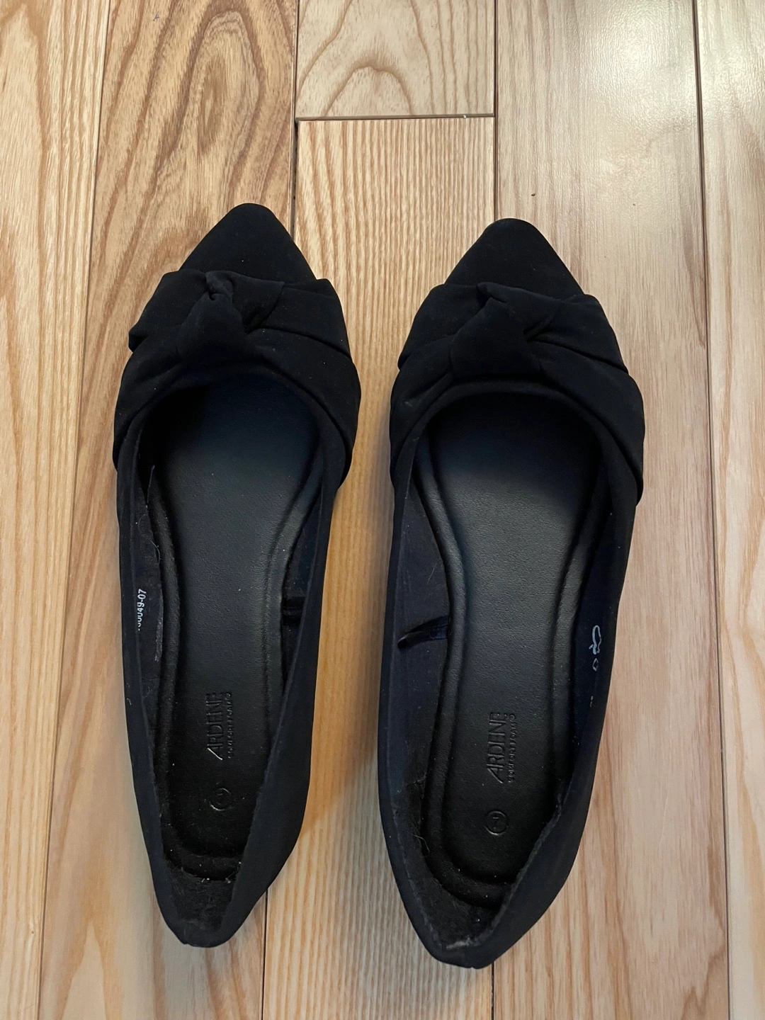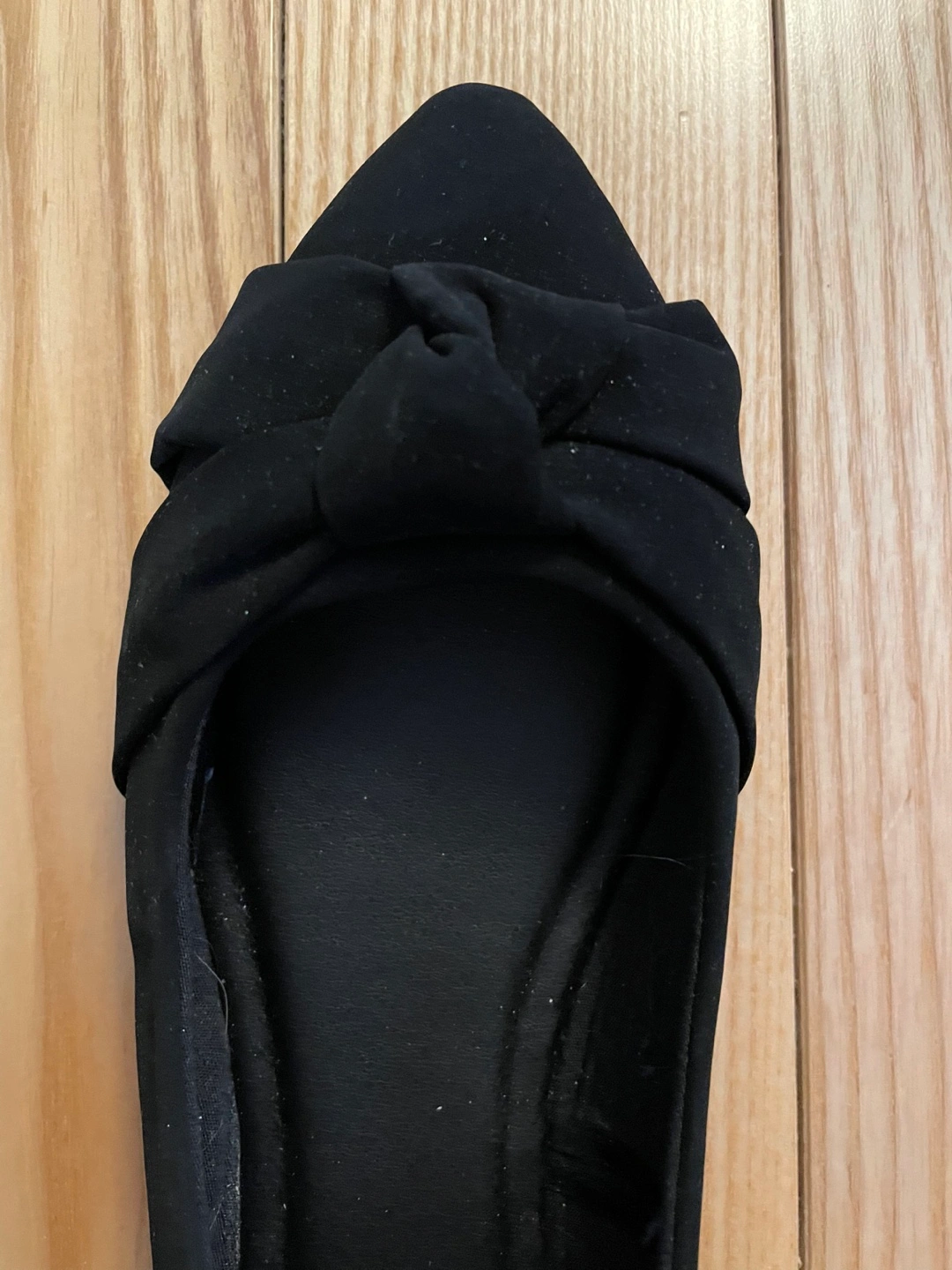 Pair of black women's flats. Pointed toe. Bow detail on the vamp. Comfort foam. Size 7.
