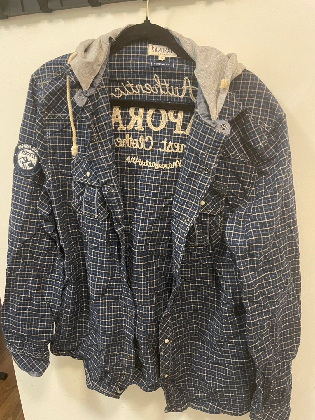558Men's long-sleeve button-up flannel shirt. Features a grey hooded neckline and embroidered detailing. Regular fit. Blue and cream plaid pattern. Patches on sleeves.