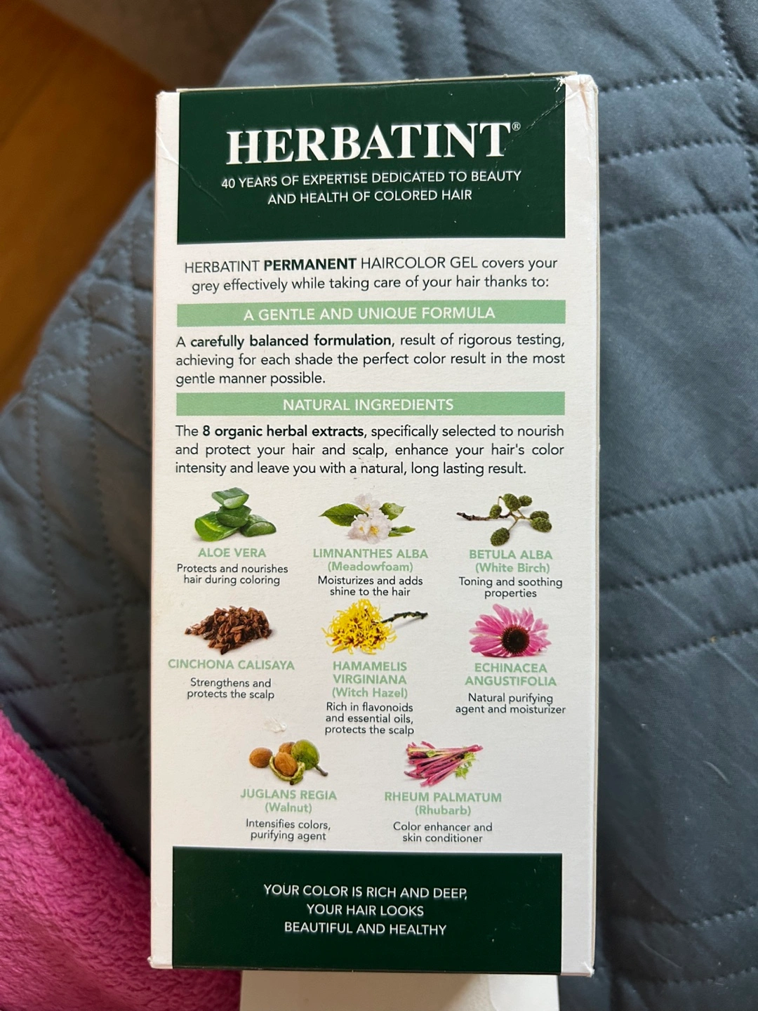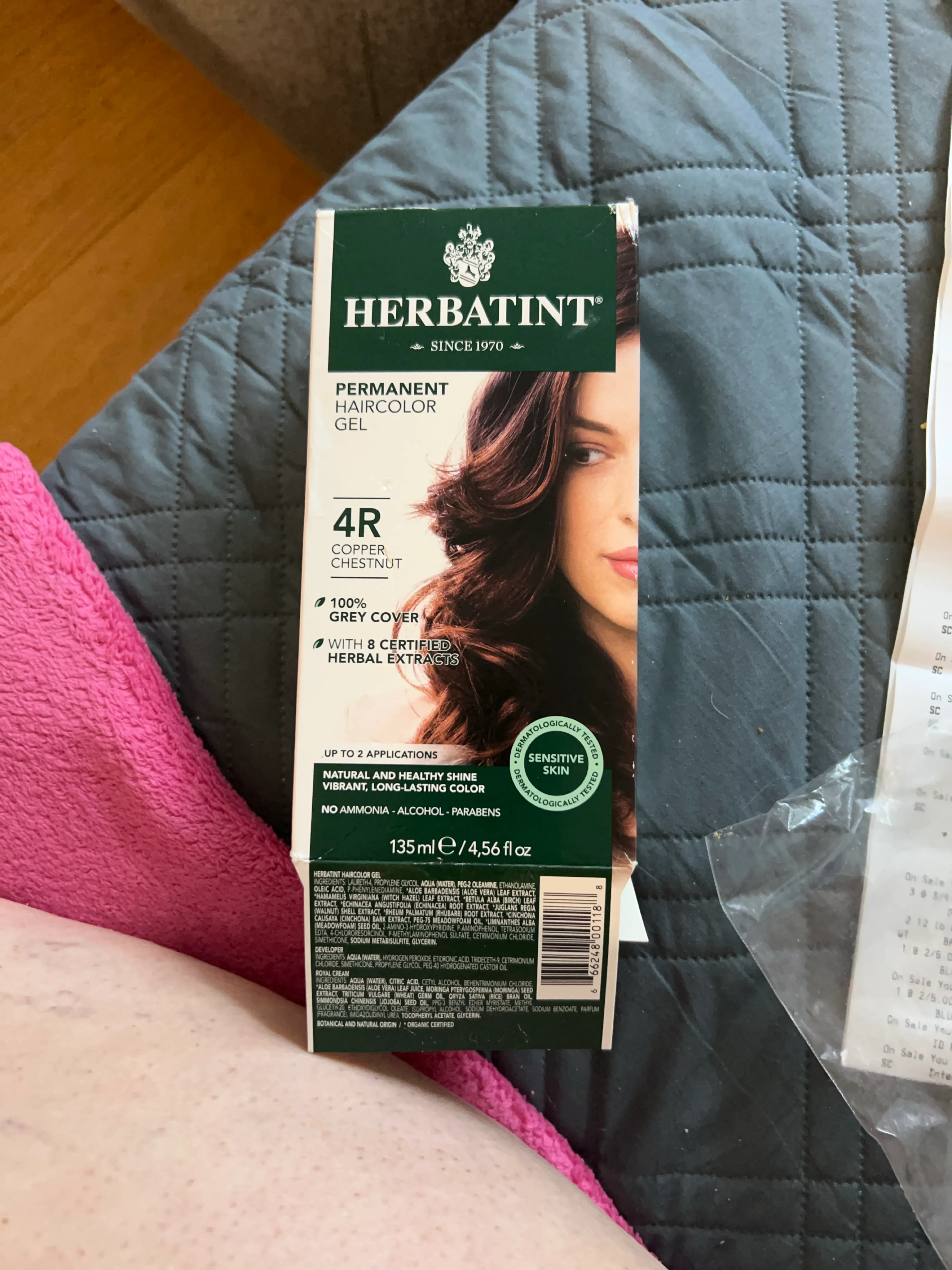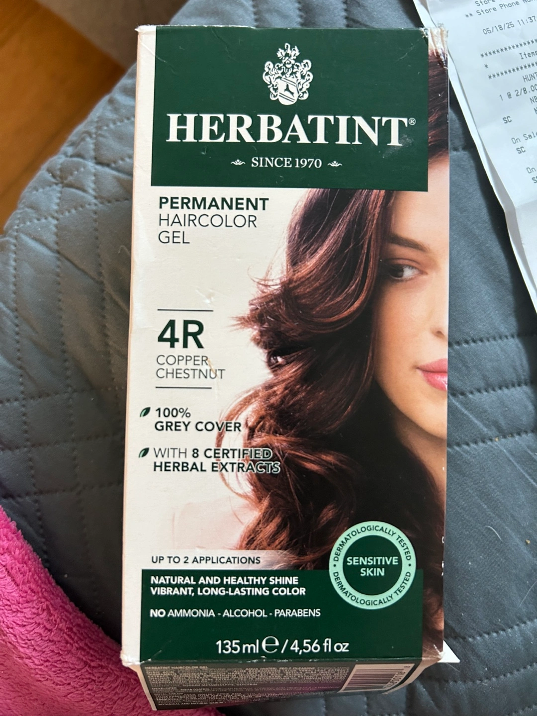 Permanent hair color gel. Shade 4R Copper Chestnut. 100% gray coverage. Up to two applications. Natural and healthy shine. No ammonia, alcohol, parabens. With 8 certified herbal extracts. For sensitive skin.