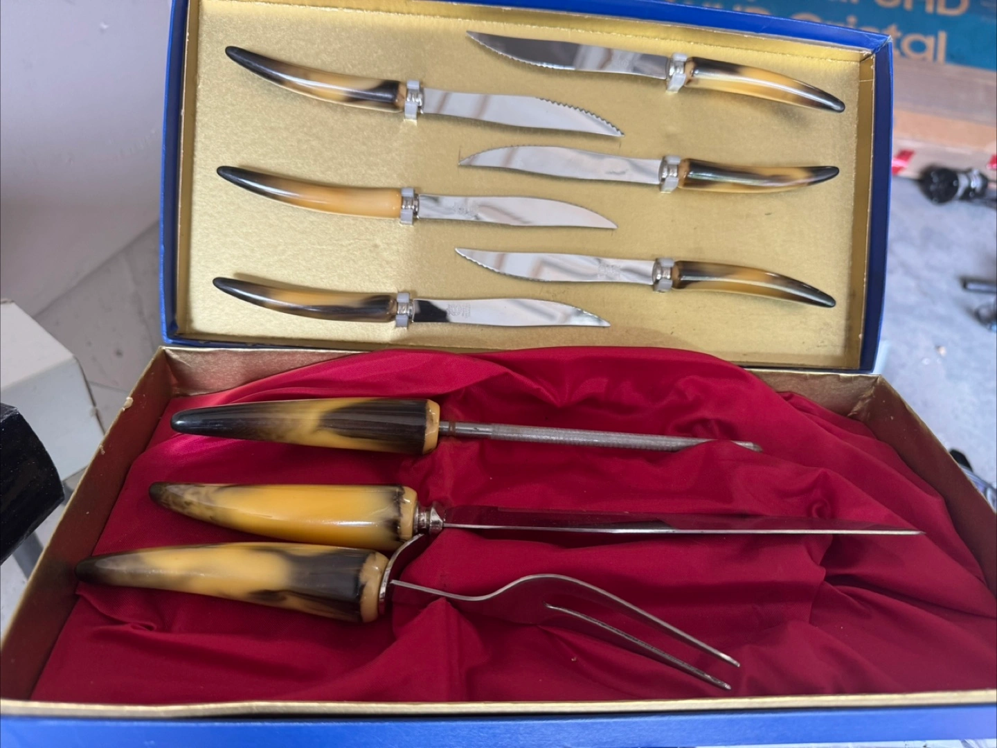 121Six steak knives and a serving set. Horn-like handles. Presented in a blue box. Looks unused.