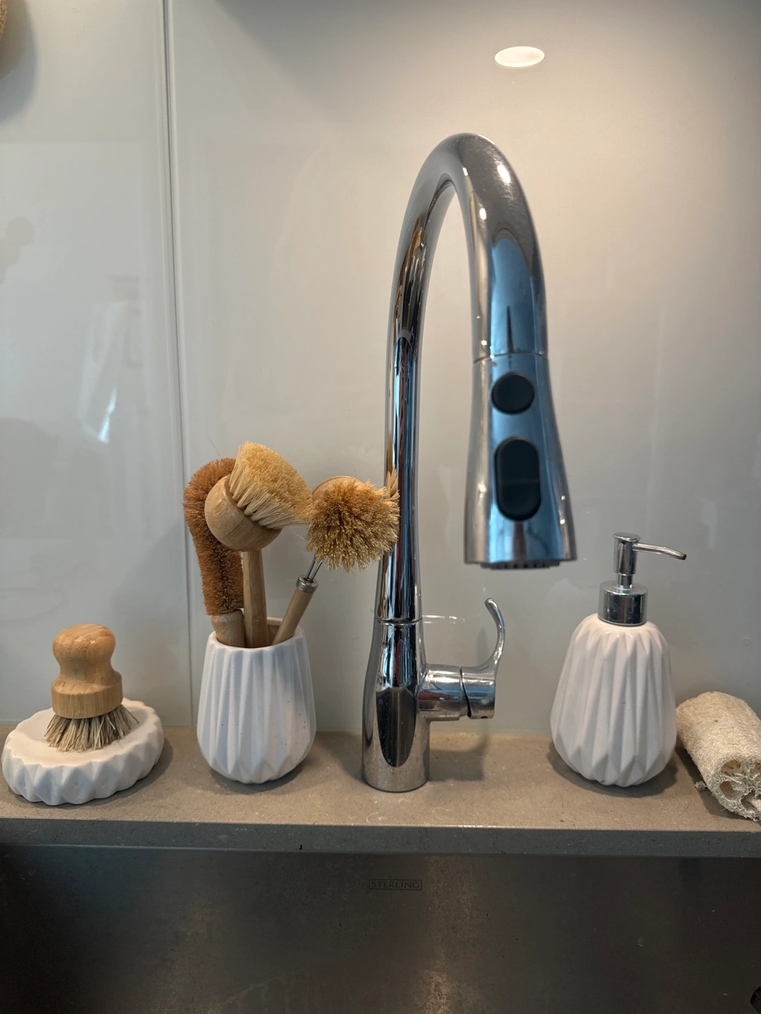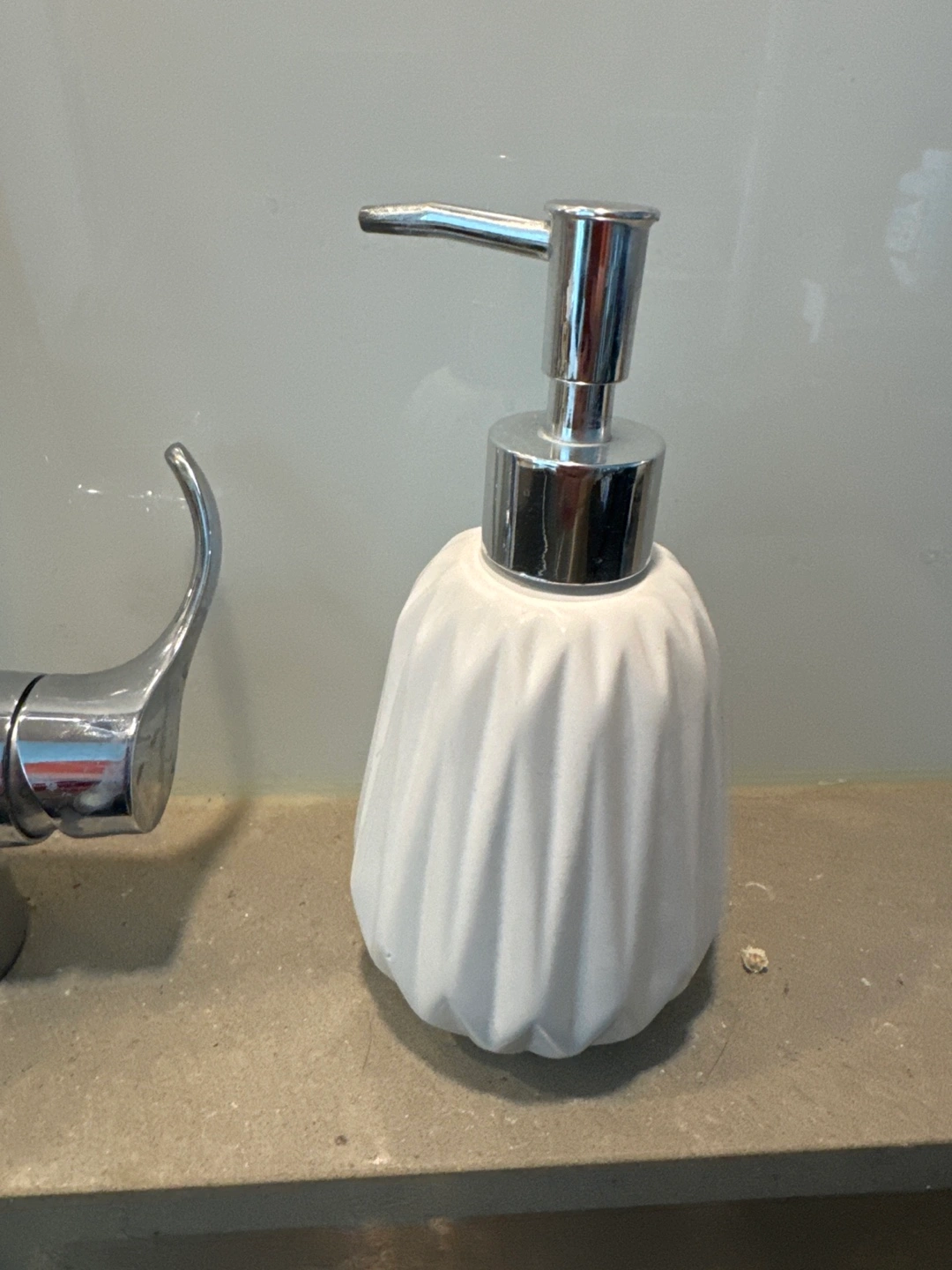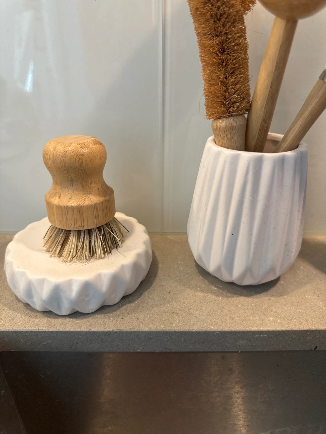 Modern, minimalist design. Includes soap dispenser and two matching ceramic holders. One holder for brushes, one for a dish brush. Perfect for a contemporary kitchen or bathroom.