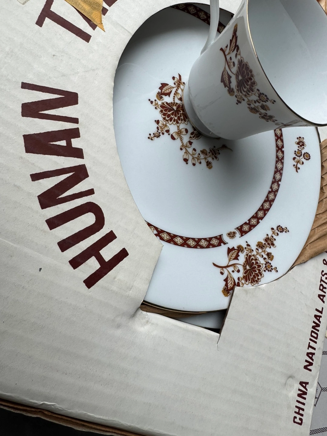 121Set of 20 pieces. Includes four dinner plates, four bread and butter plates, four soup/cereal bowls, four cups, and four saucers. Brown and gold floral design. Brand new in box.