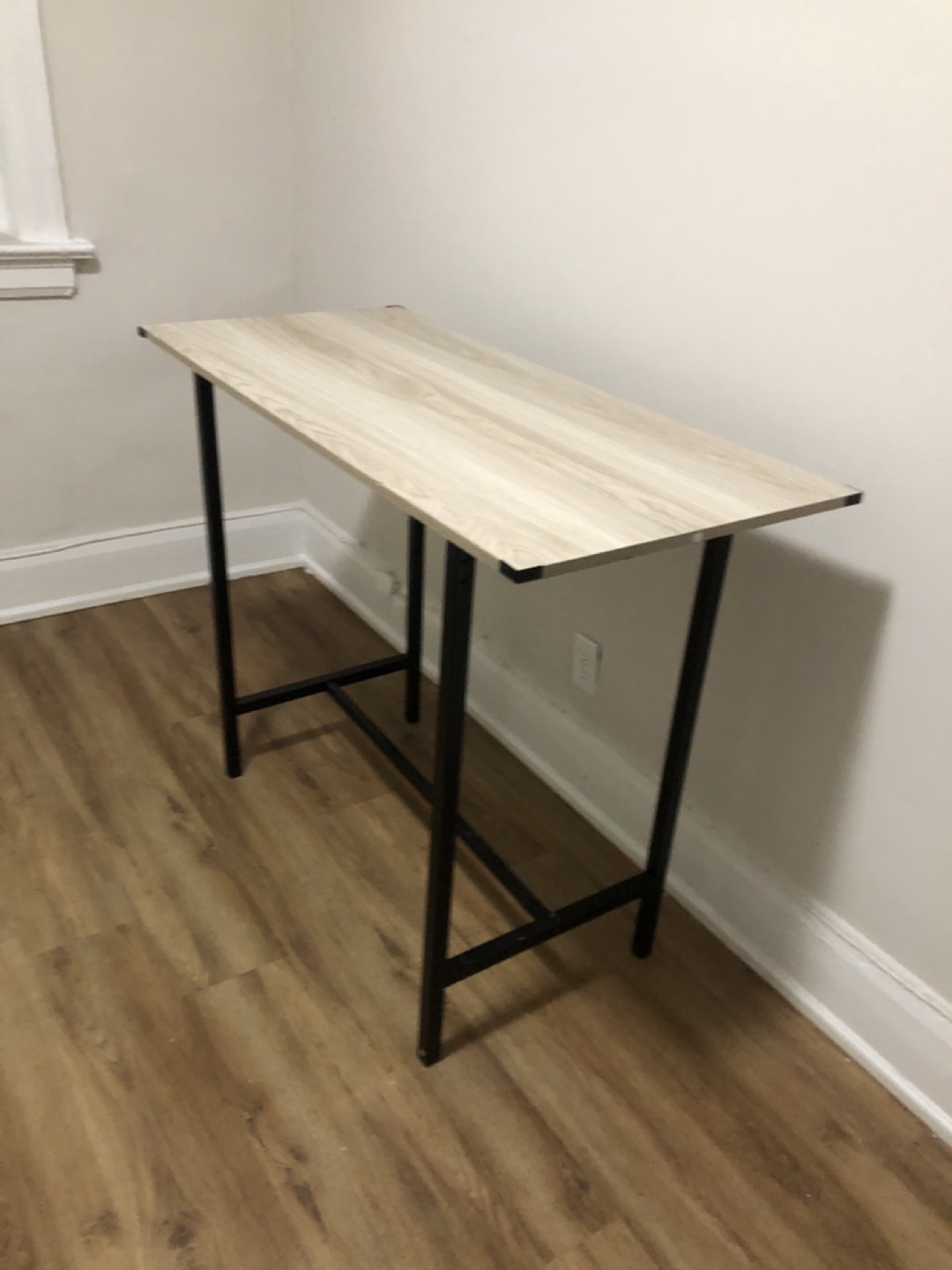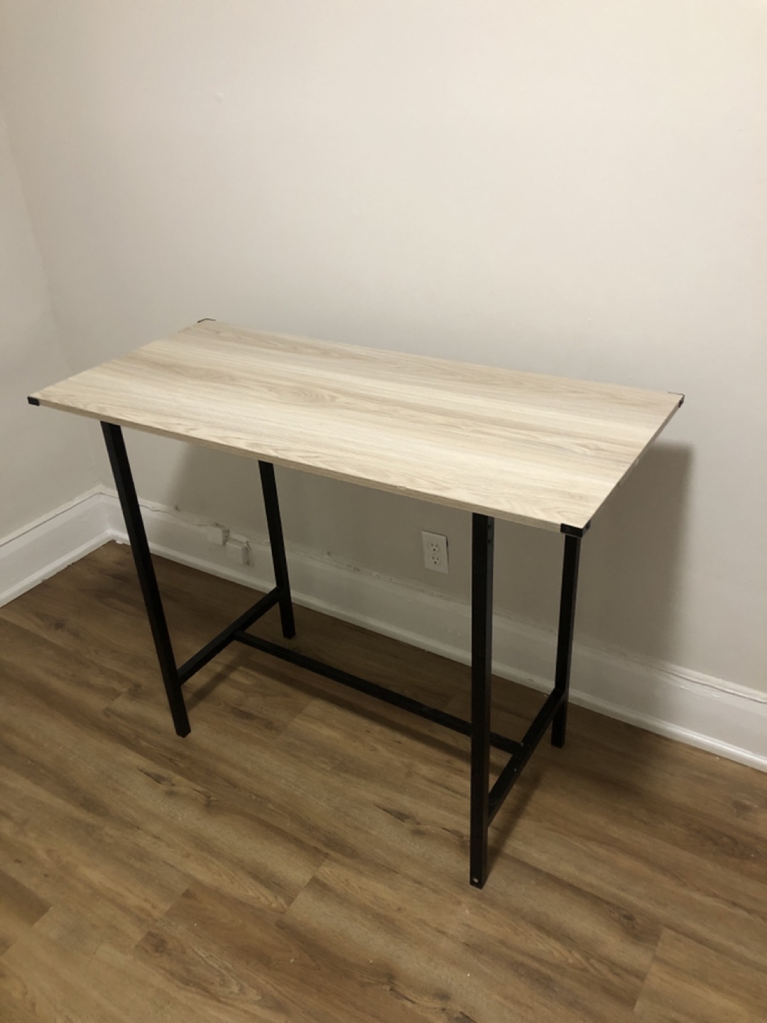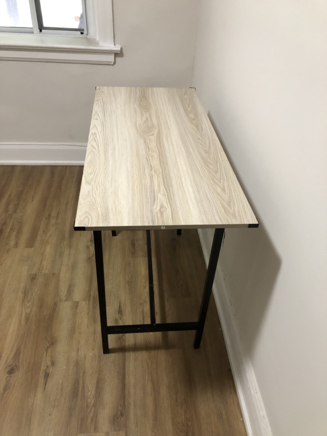 Small, simple desk. Light wood-look top, black metal legs. Approximately 46 inches wide and 37 inches tall. With chair Good for small spaces.