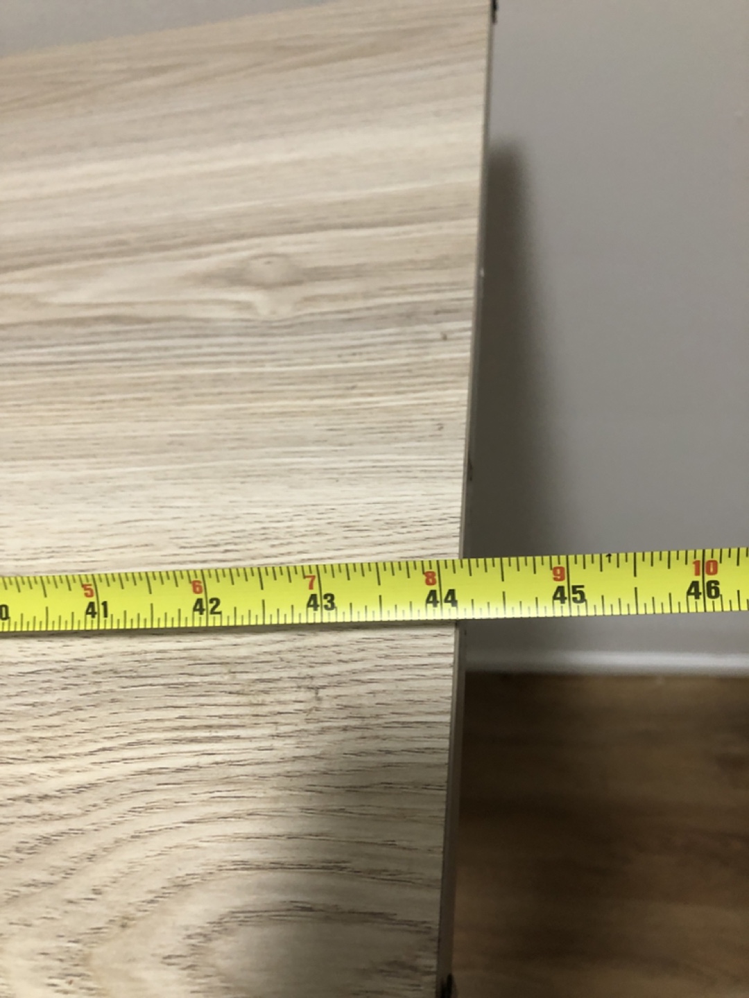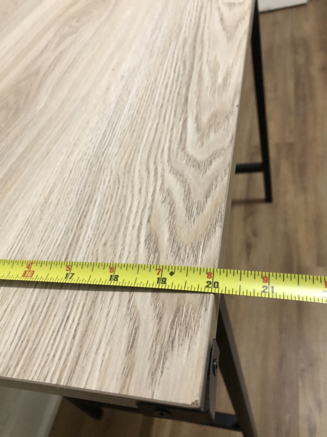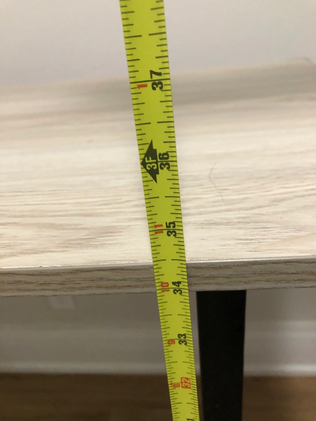 Small, simple desk. Light wood-look top, black metal legs. Approximately 46 inches wide and 37 inches tall. With chair Good for small spaces.